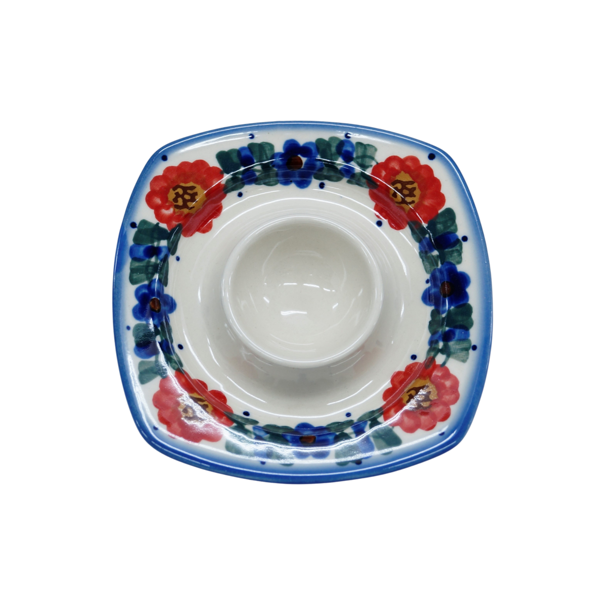 Podstawka na jajko w kształcie kwadratowego talerzyka z wyprofilowanym na środku pojemnikiem na jajko. To produkt oryginalnej ceramiki bolesławieckiej, powstały według tradycyjnych metod wytwarzania ceramiki artystycznej, ręcznie zdobionej w manufakturze ceramiki artystycznej, ANDY CERAMIKA.