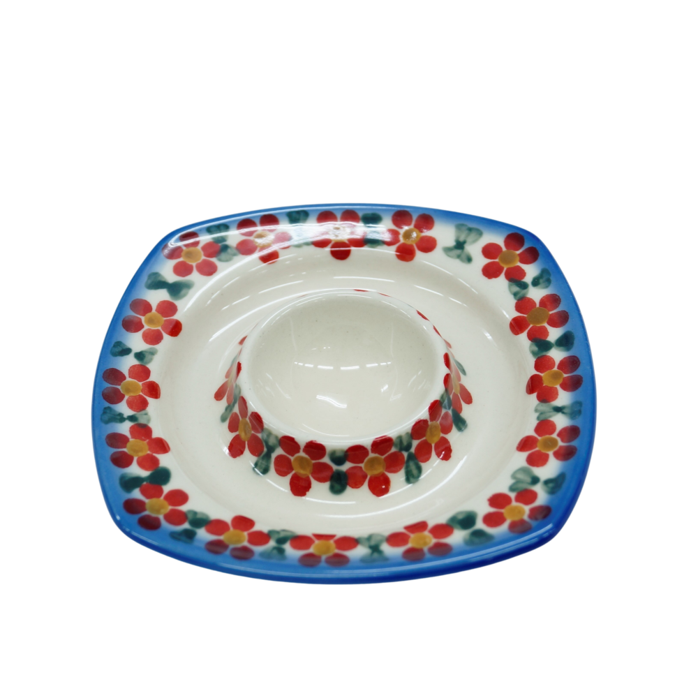 Podstawka na jajko w kształcie kwadratowego talerzyka z wyprofilowanym na środku pojemnikiem na jajko. To produkt oryginalnej ceramiki bolesławieckiej, powstały według tradycyjnych metod wytwarzania ceramiki artystycznej, ręcznie zdobionej w manufakturze ceramiki artystycznej, ANDY CERAMIKA.