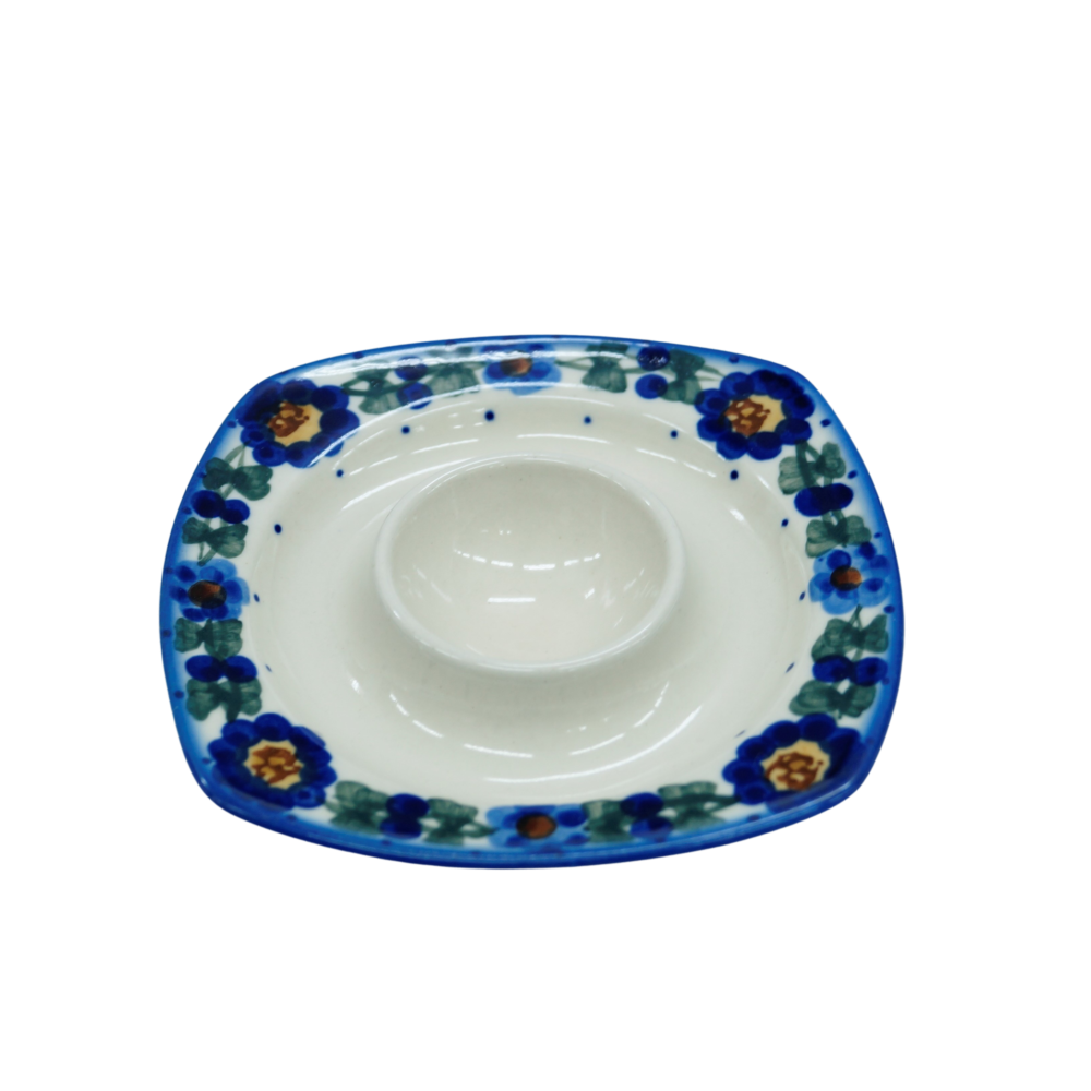 Podstawka na jajko w kształcie kwadratowego talerzyka z wyprofilowanym na środku pojemnikiem na jajko. To produkt oryginalnej ceramiki bolesławieckiej, powstały według tradycyjnych metod wytwarzania ceramiki artystycznej, ręcznie zdobionej w manufakturze ceramiki artystycznej, ANDY CERAMIKA.