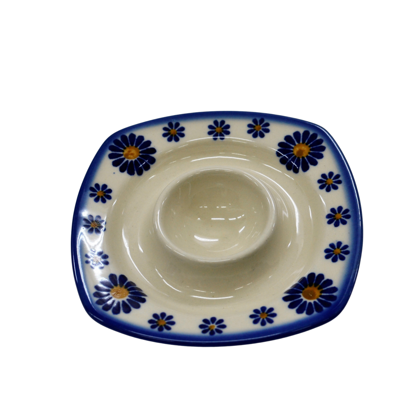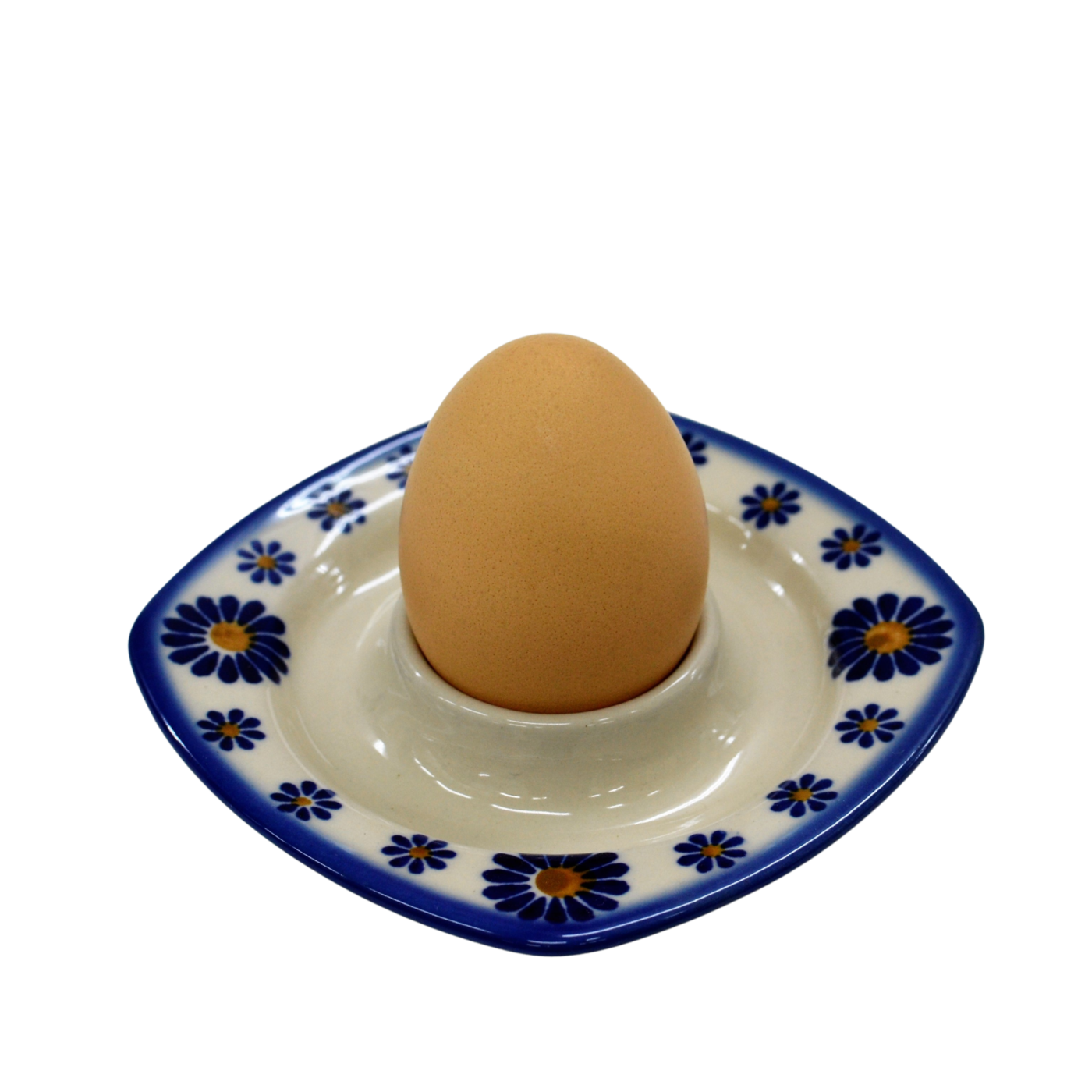 Podstawka na jajko w kształcie kwadratowego talerzyka z wyprofilowanym na środku pojemnikiem na jajko. To produkt oryginalnej ceramiki bolesławieckiej, powstały według tradycyjnych metod wytwarzania ceramiki artystycznej, ręcznie zdobionej w manufakturze ceramiki artystycznej, ANDY CERAMIKA.