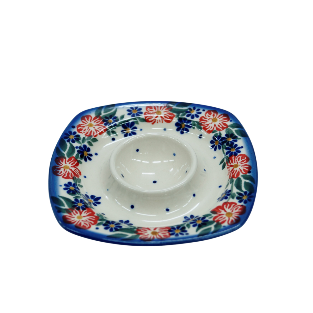 Podstawka na jajko w kształcie kwadratowego talerzyka z wyprofilowanym na środku pojemnikiem na jajko. To produkt oryginalnej ceramiki bolesławieckiej, powstały według tradycyjnych metod wytwarzania ceramiki artystycznej, ręcznie zdobionej w manufakturze ceramiki artystycznej, ANDY CERAMIKA.