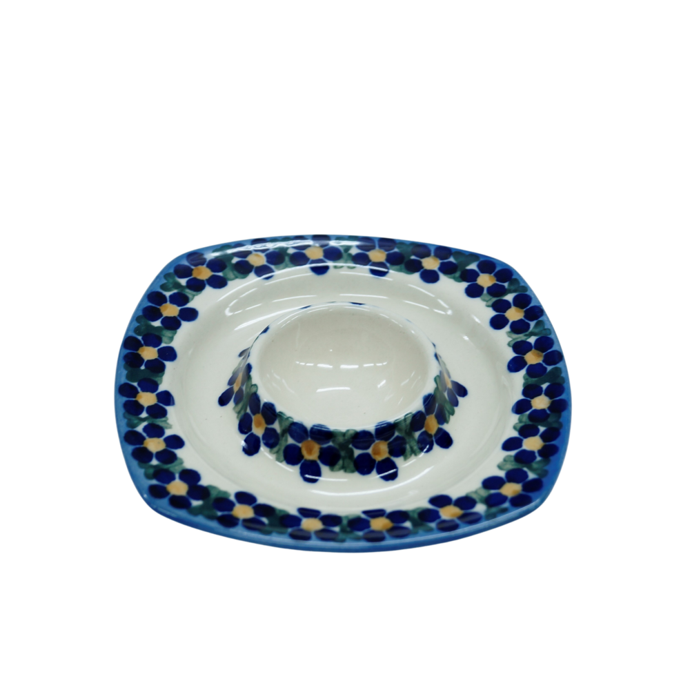 Podstawka na jajko w kształcie kwadratowego talerzyka z wyprofilowanym na środku pojemnikiem na jajko. To produkt oryginalnej ceramiki bolesławieckiej, powstały według tradycyjnych metod wytwarzania ceramiki artystycznej, ręcznie zdobionej w manufakturze ceramiki artystycznej, ANDY CERAMIKA.