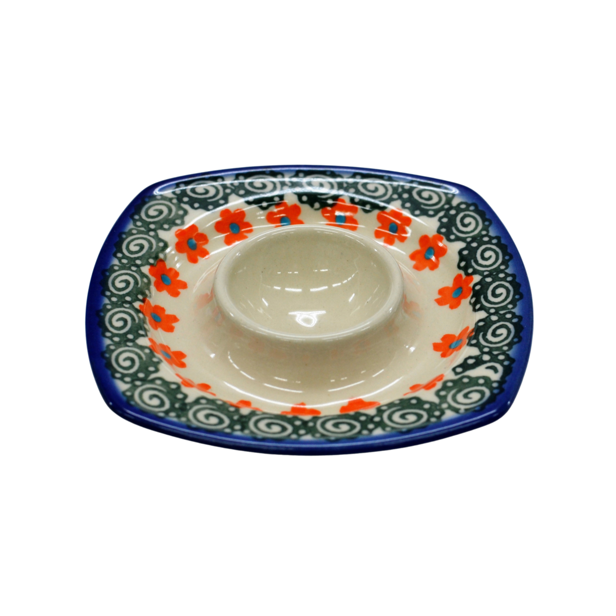 Podstawka na jajko w kształcie kwadratowego talerzyka z wyprofilowanym na środku pojemnikiem na jajko. To produkt oryginalnej ceramiki bolesławieckiej, powstały według tradycyjnych metod wytwarzania ceramiki artystycznej, ręcznie zdobionej w manufakturze ceramiki artystycznej, ANDY CERAMIKA.