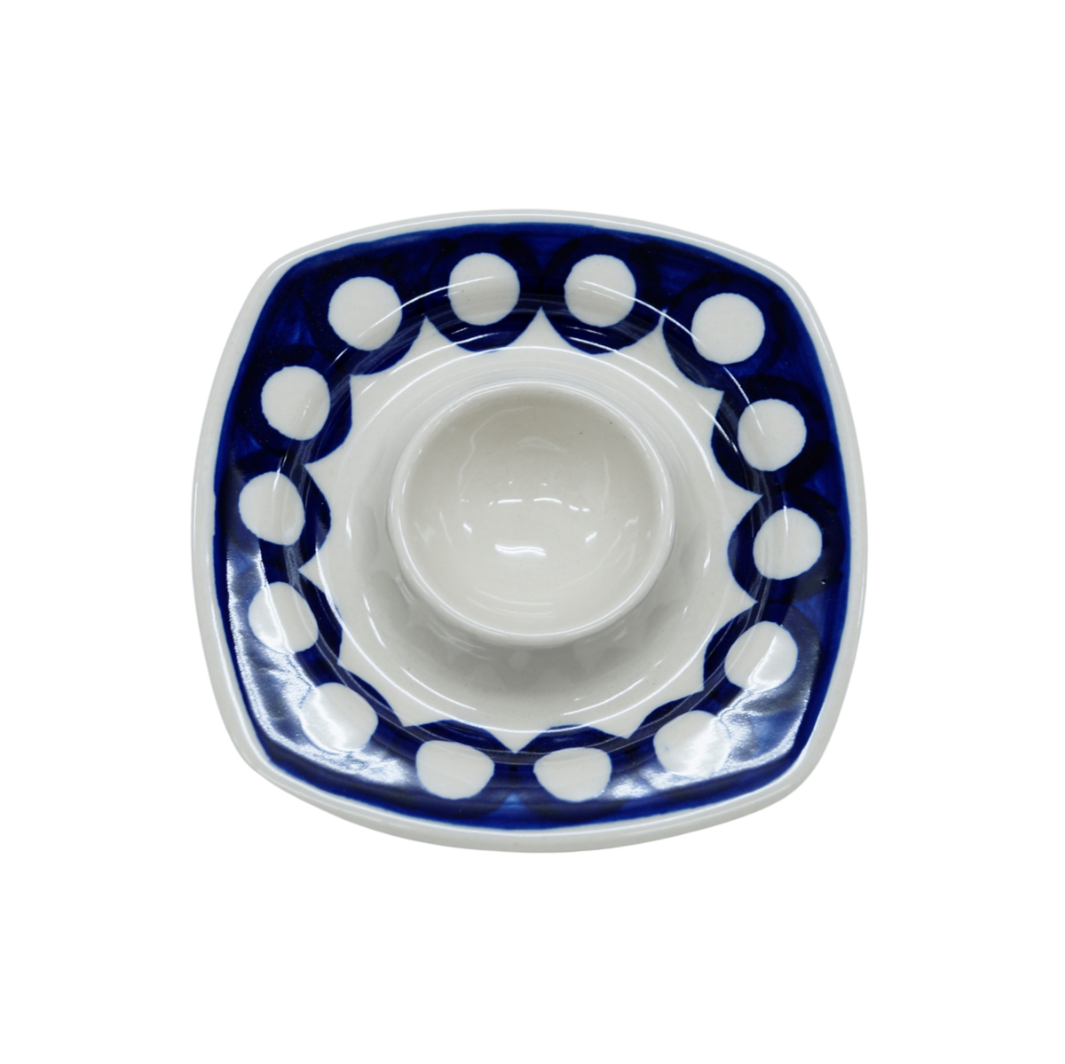 Podstawka na jajko w kształcie kwadratowego talerzyka z wyprofilowanym na środku pojemnikiem na jajko. To produkt oryginalnej ceramiki bolesławieckiej, powstały według tradycyjnych metod wytwarzania ceramiki artystycznej, ręcznie zdobionej w manufakturze ceramiki artystycznej, ANDY CERAMIKA.