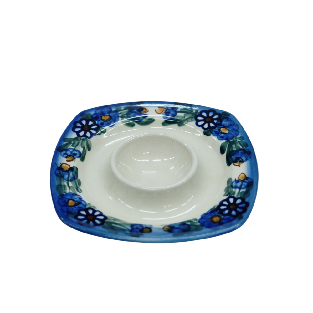 Podstawka na jajko w kształcie kwadratowego talerzyka z wyprofilowanym na środku pojemnikiem na jajko. To produkt oryginalnej ceramiki bolesławieckiej, powstały według tradycyjnych metod wytwarzania ceramiki artystycznej, ręcznie zdobionej w manufakturze ceramiki artystycznej, ANDY CERAMIKA.