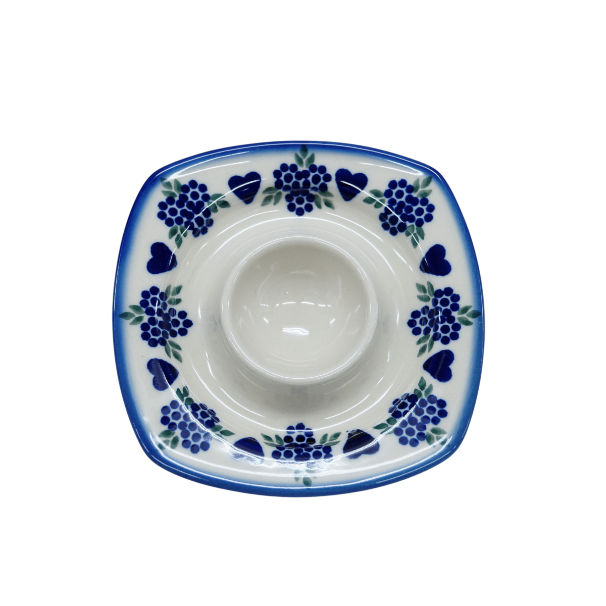 Podstawka na jajko w kształcie kwadratowego talerzyka z wyprofilowanym na środku pojemnikiem na jajko. To produkt oryginalnej ceramiki bolesławieckiej, powstały według tradycyjnych metod wytwarzania ceramiki artystycznej, ręcznie zdobionej w manufakturze ceramiki artystycznej, ANDY CERAMIKA.
