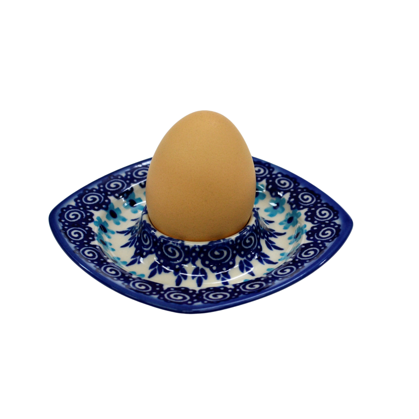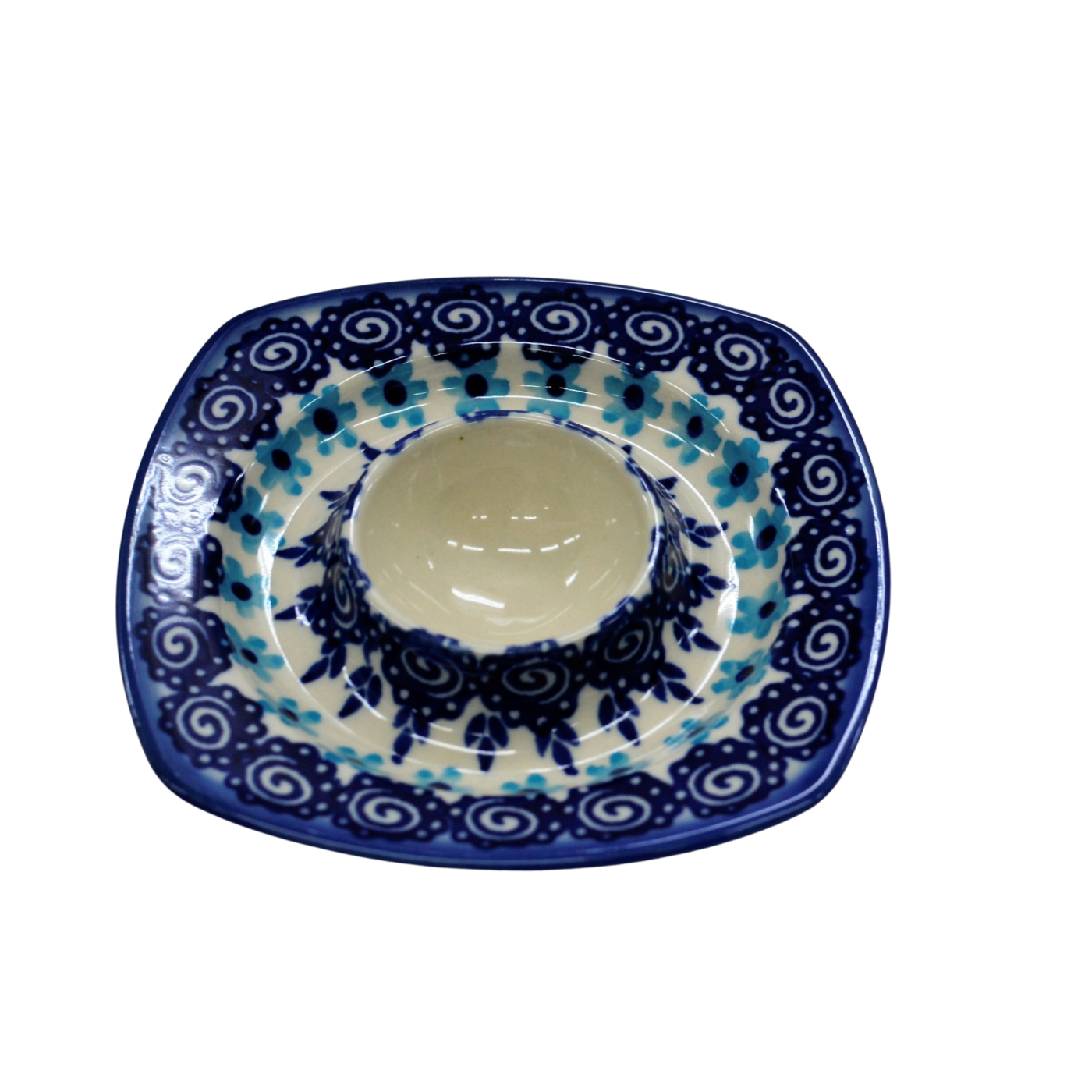 Podstawka na jajko w kształcie kwadratowego talerzyka z wyprofilowanym na środku pojemnikiem na jajko. To produkt oryginalnej ceramiki bolesławieckiej, powstały według tradycyjnych metod wytwarzania ceramiki artystycznej, ręcznie zdobionej w manufakturze ceramiki artystycznej, ANDY CERAMIKA.