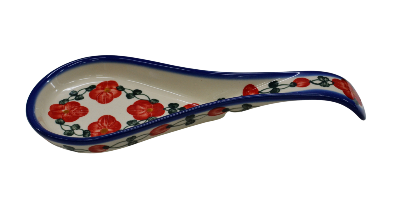 Tacka (podstawka) specjalnie wyprofilowany uchwyt, do łatwiejszego umieszczania akcesoriów do gotowania (szpatułek, łopatek, łyżek i łyżeczek, chochli i chochelek), jest ręcznie dekorowana w fabryce ceramiki bolesławieckiej w unikatowe dekoracje kwiatowe i tradycyjne stempelki.