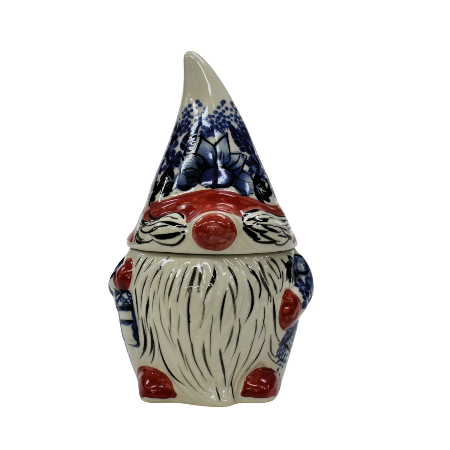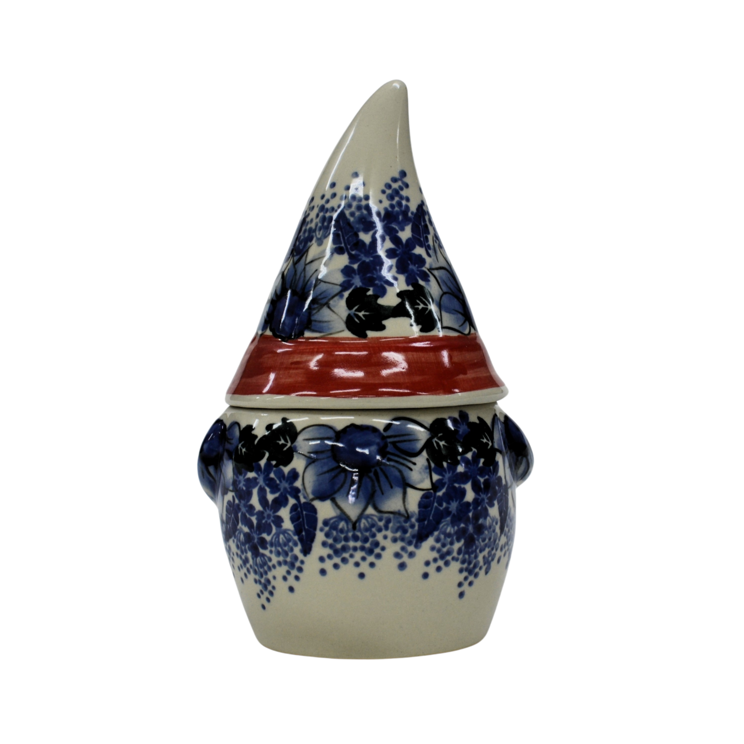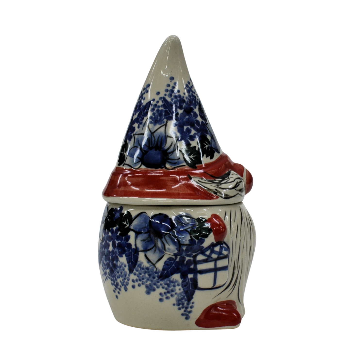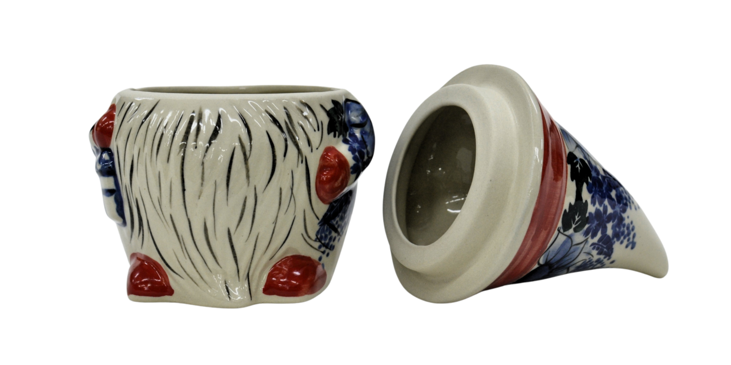 Pojemnik ceramiczny w kształcie Krasnala, gnoma z przykrywką ceramiczną.