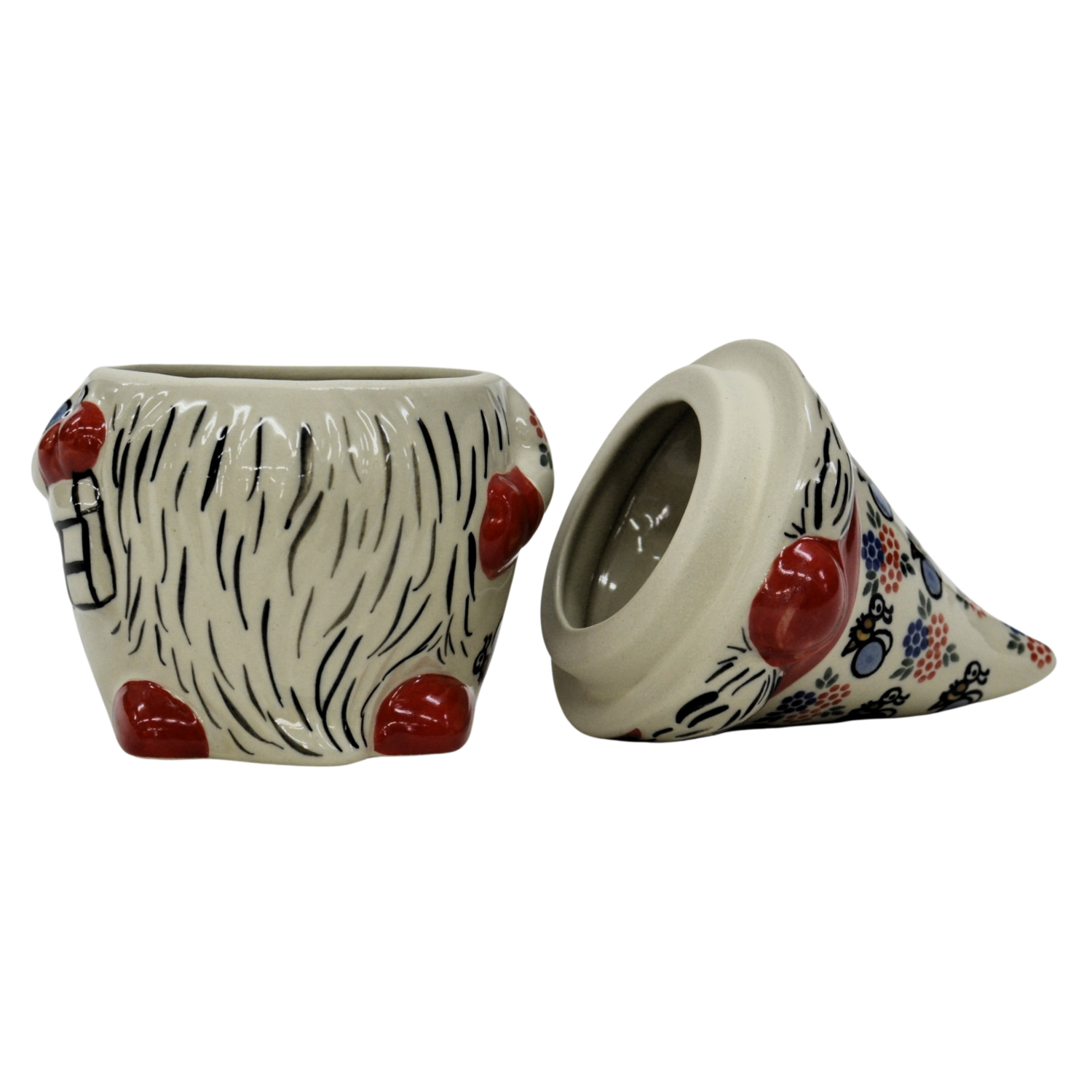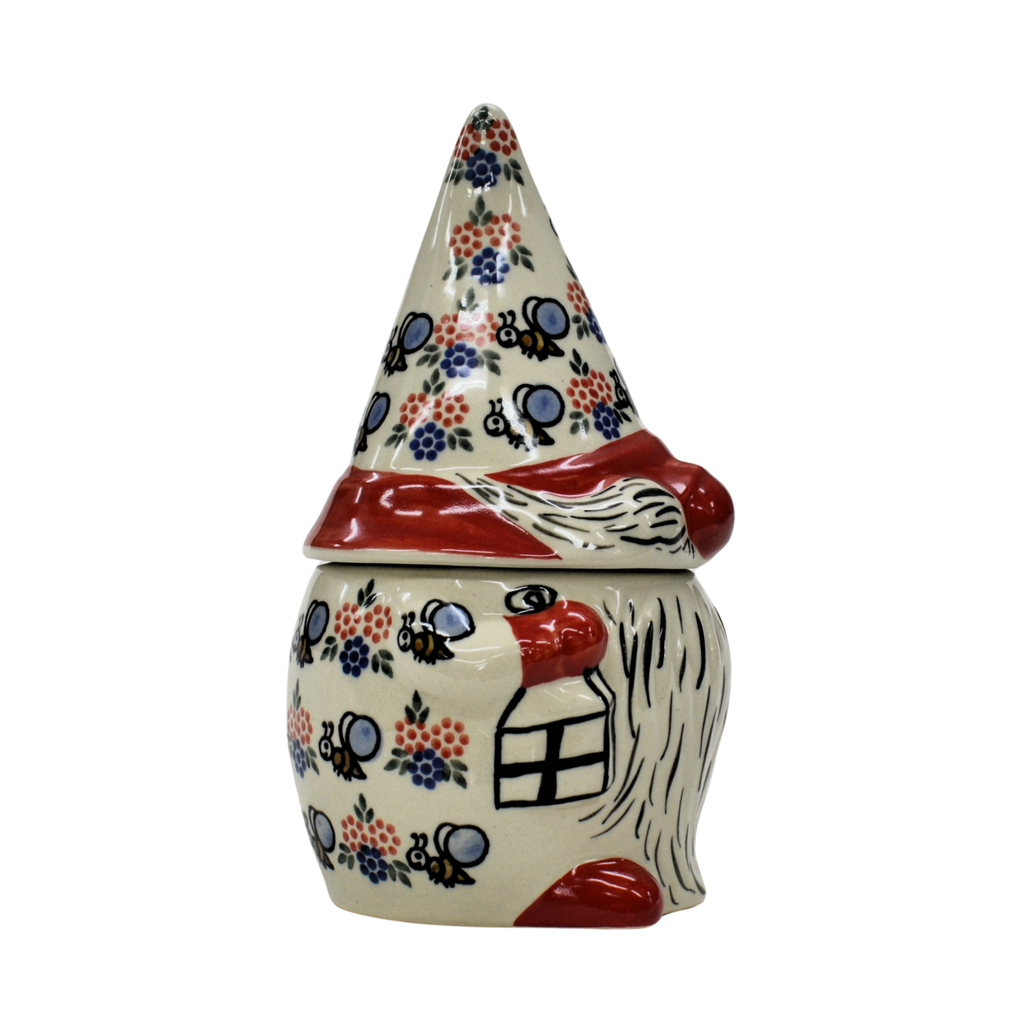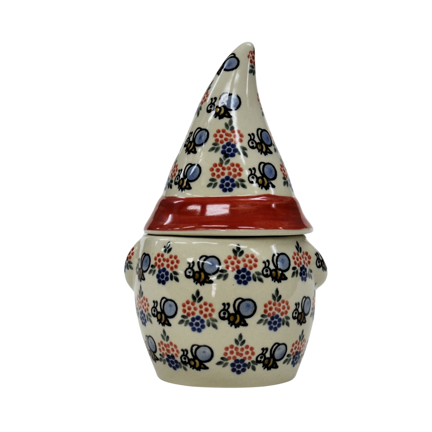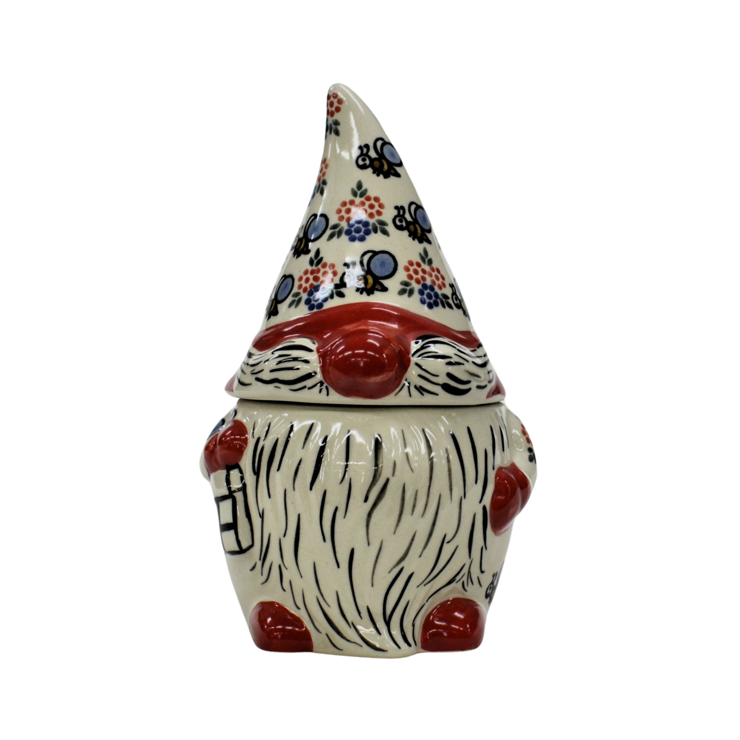 Pojemnik ceramiczny w kształcie Krasnala, gnoma z przykrywką ceramiczną.