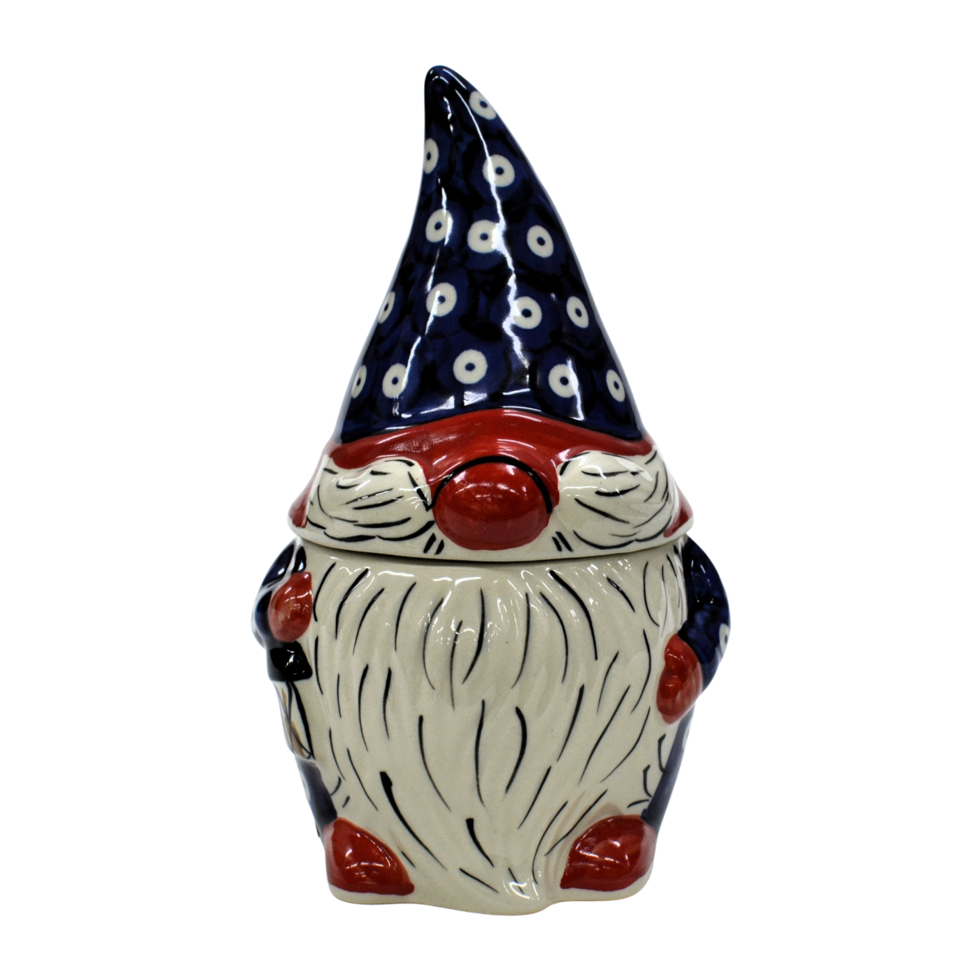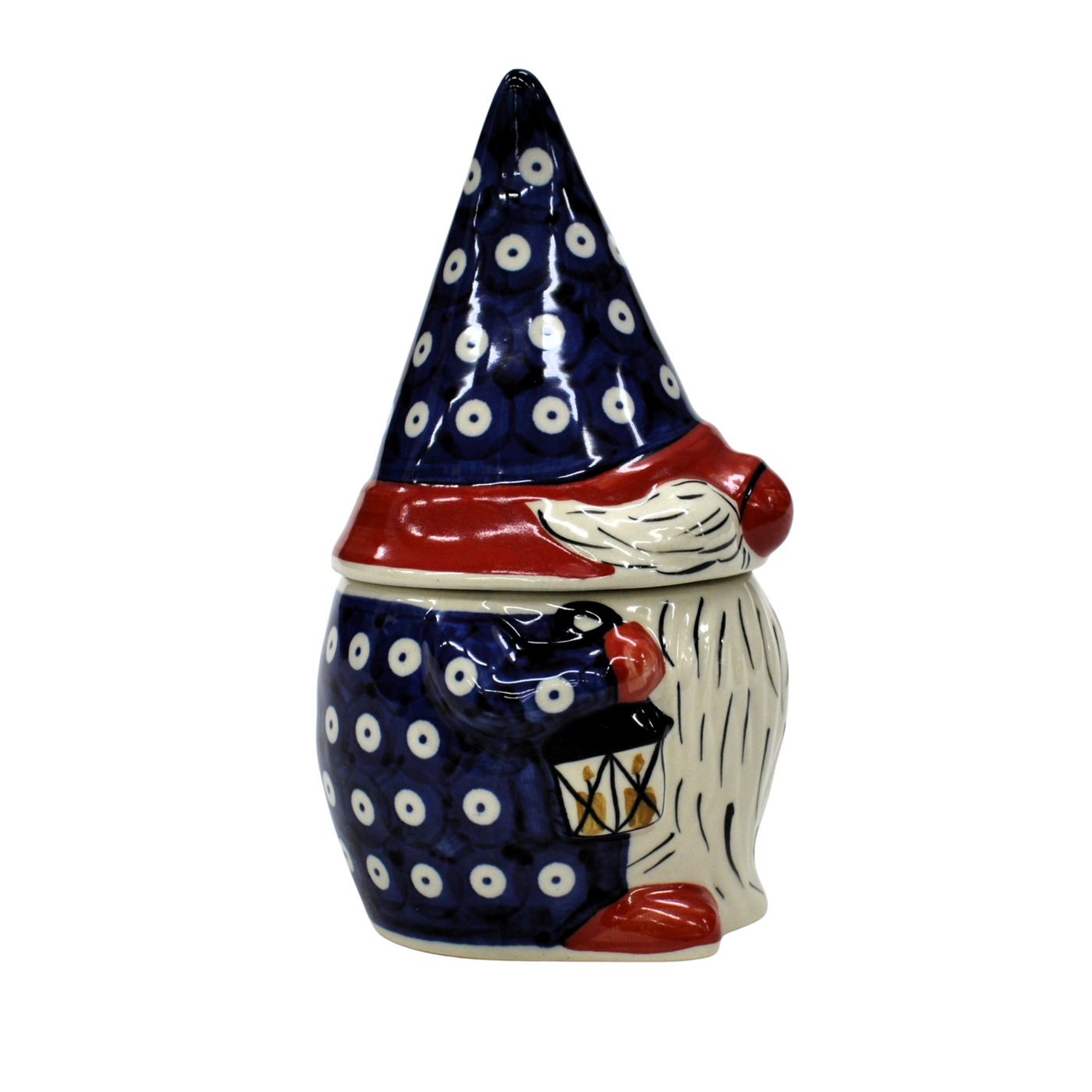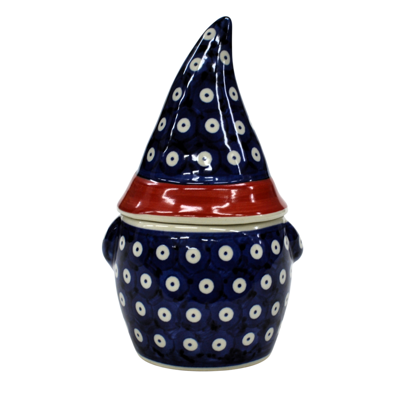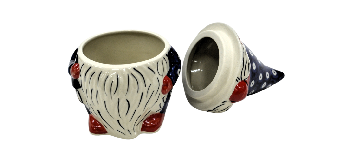 Pojemnik ceramiczny w kształcie Krasnala, gnoma z przykrywką ceramiczną.