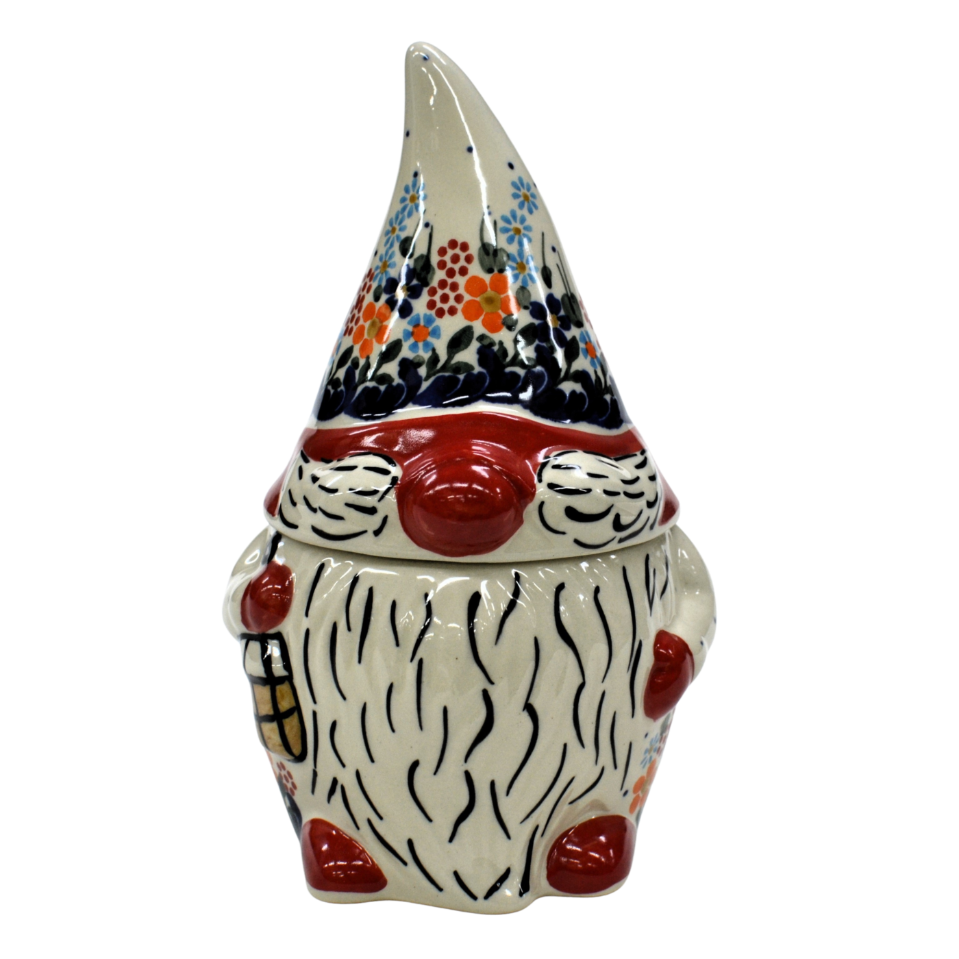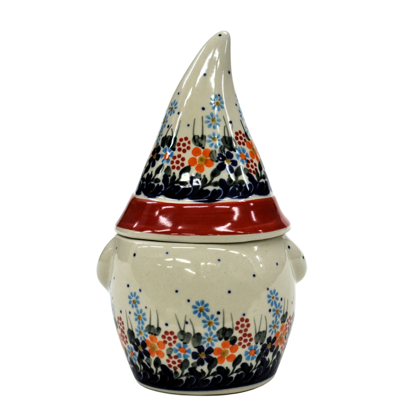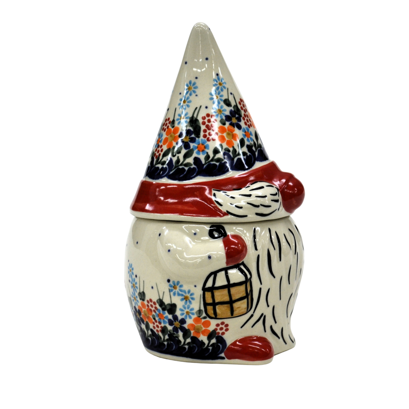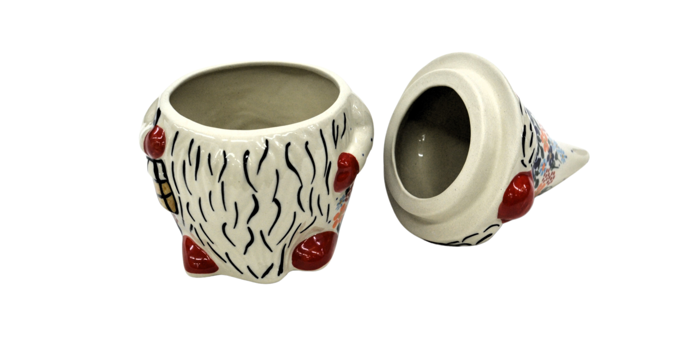 Pojemnik ceramiczny w kształcie Krasnala, gnoma z przykrywką ceramiczną.