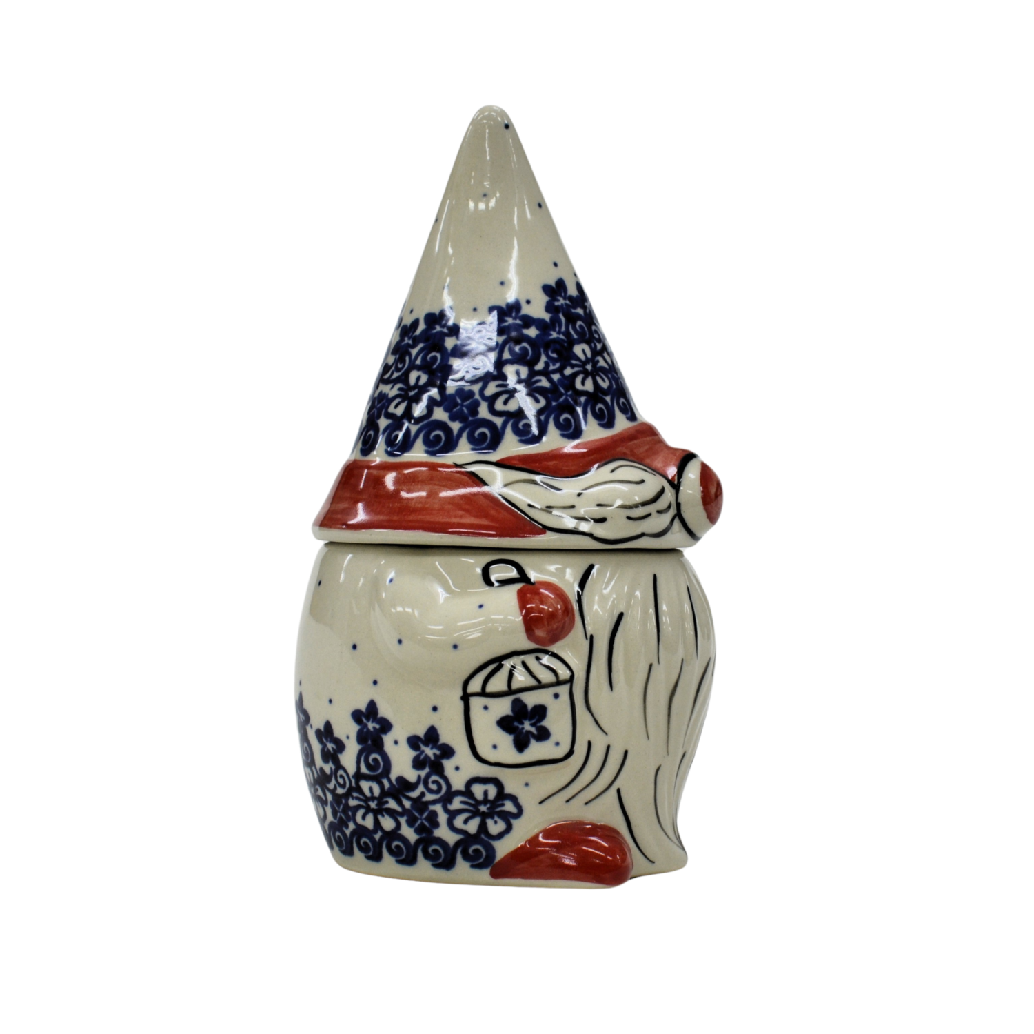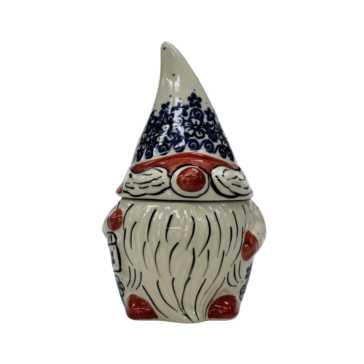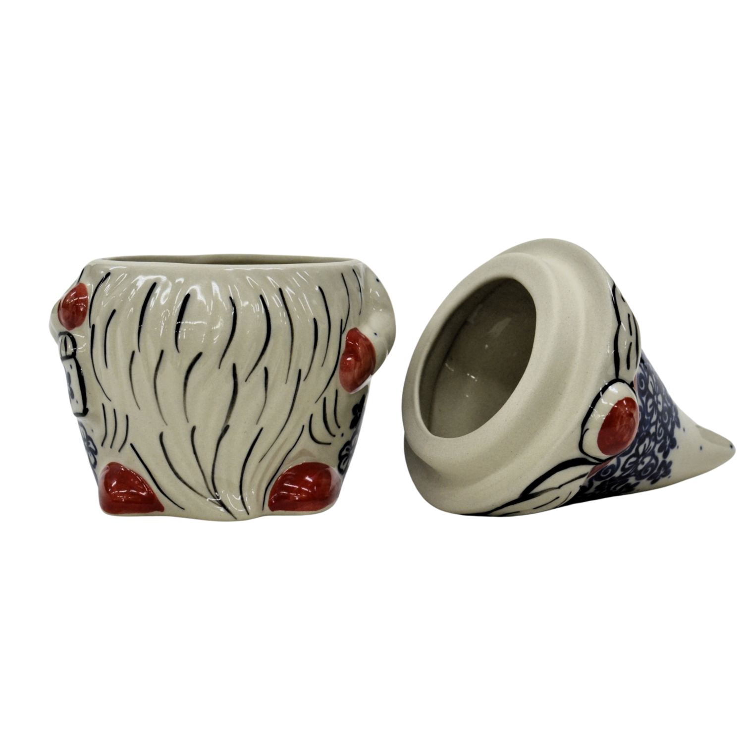 Pojemnik ceramiczny w kształcie Krasnala, gnoma z przykrywką ceramiczną.
