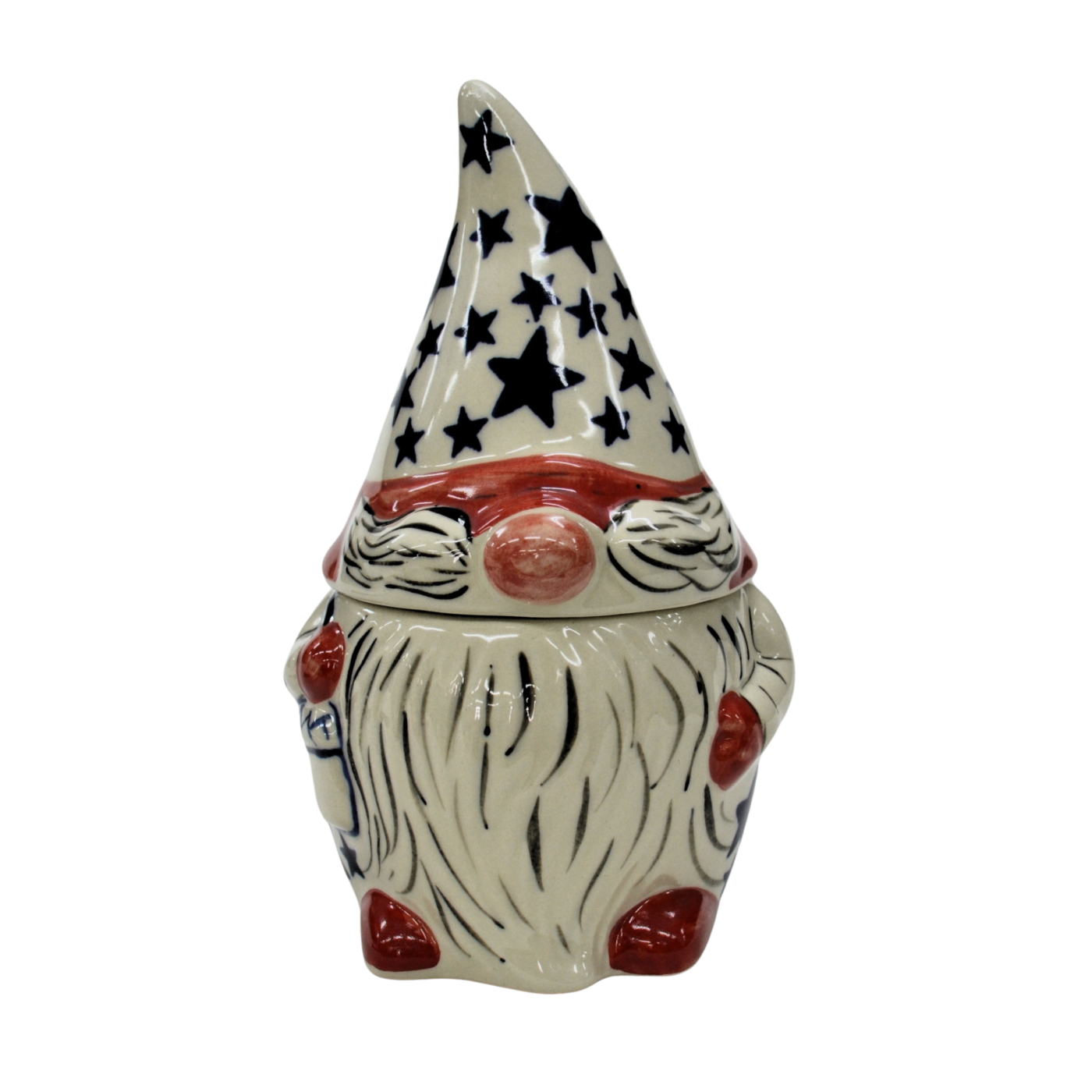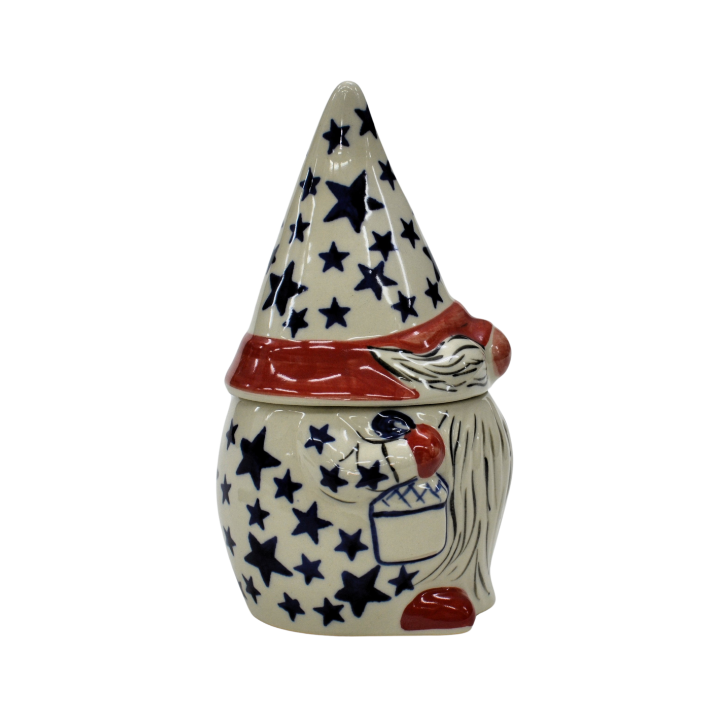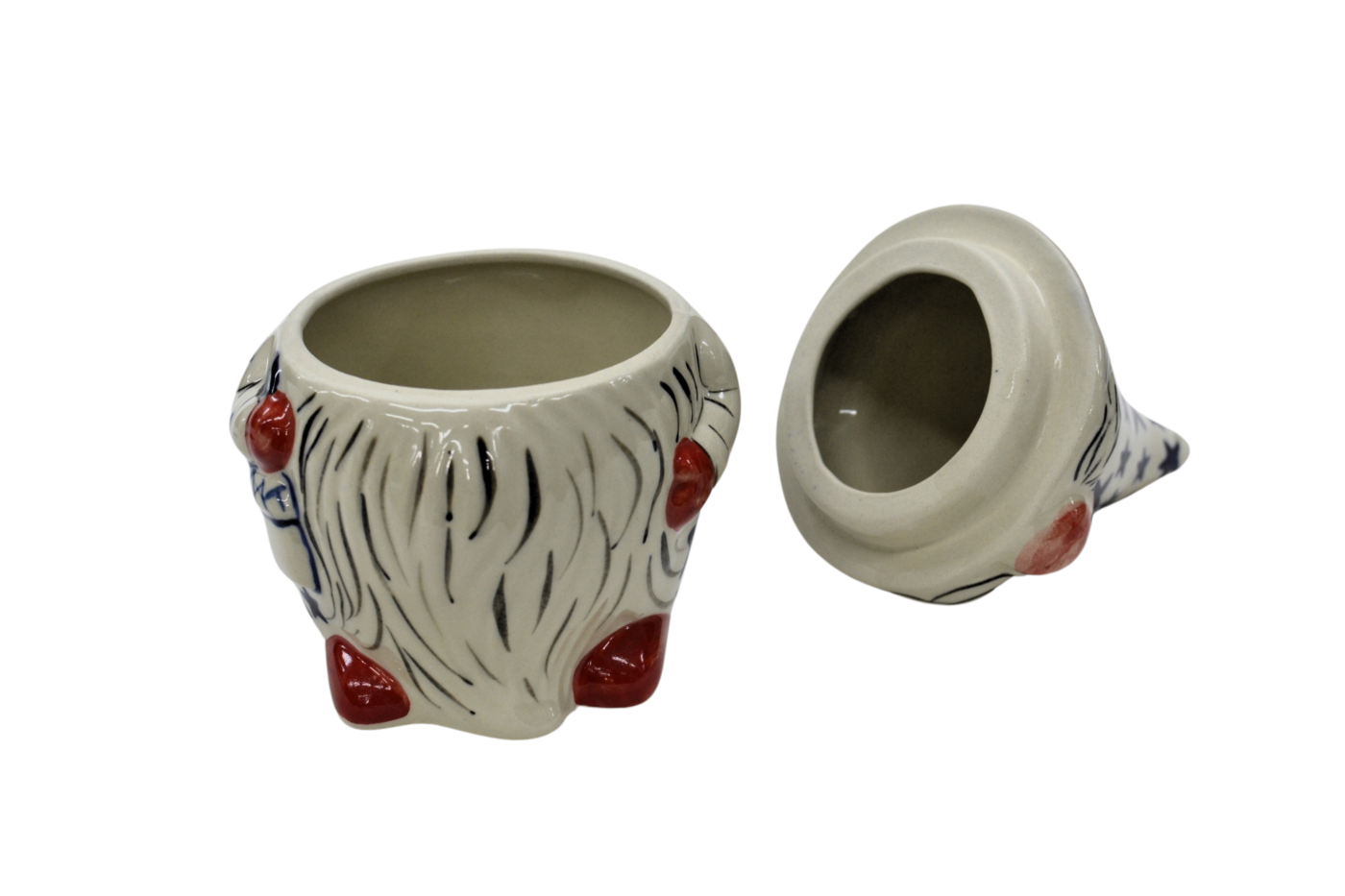 Pojemnik ceramiczny w kształcie Krasnala, gnoma z przykrywką ceramiczną.