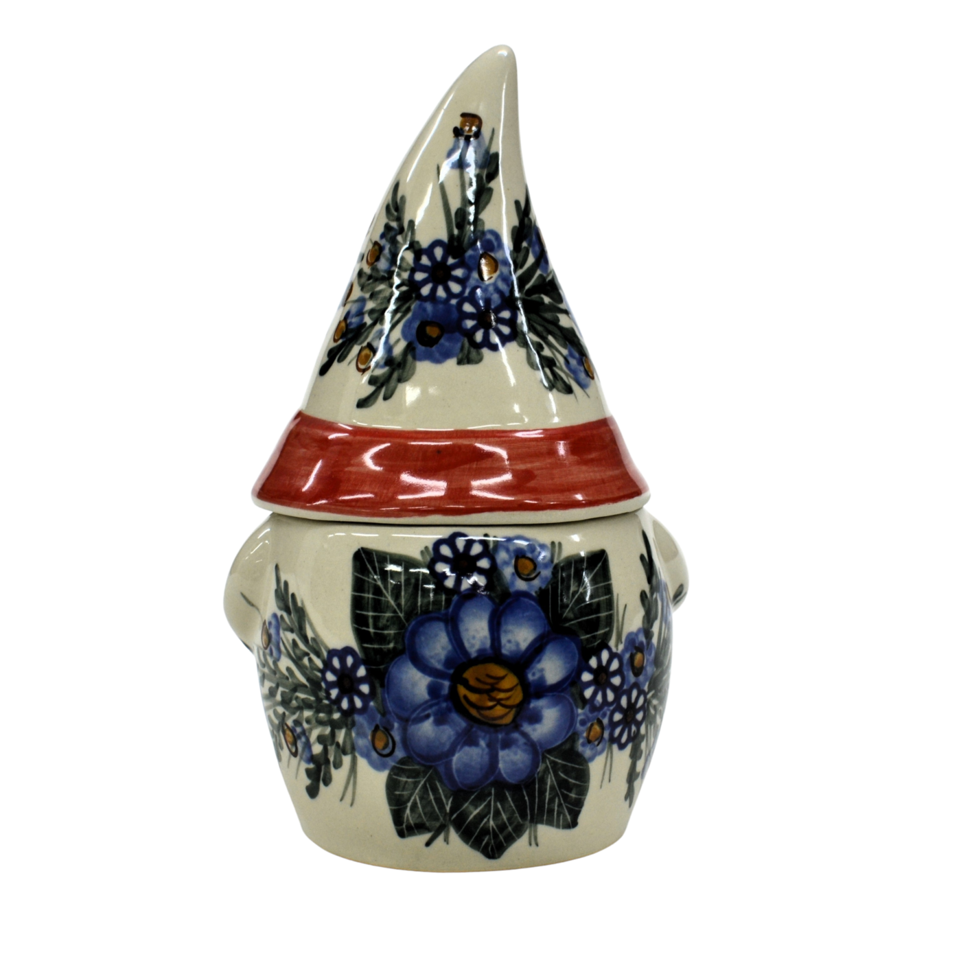 Pojemnik ceramiczny w kształcie Krasnala, gnoma z przykrywką ceramiczną.