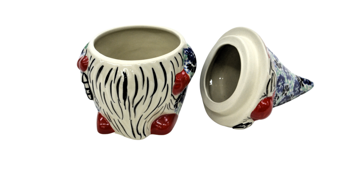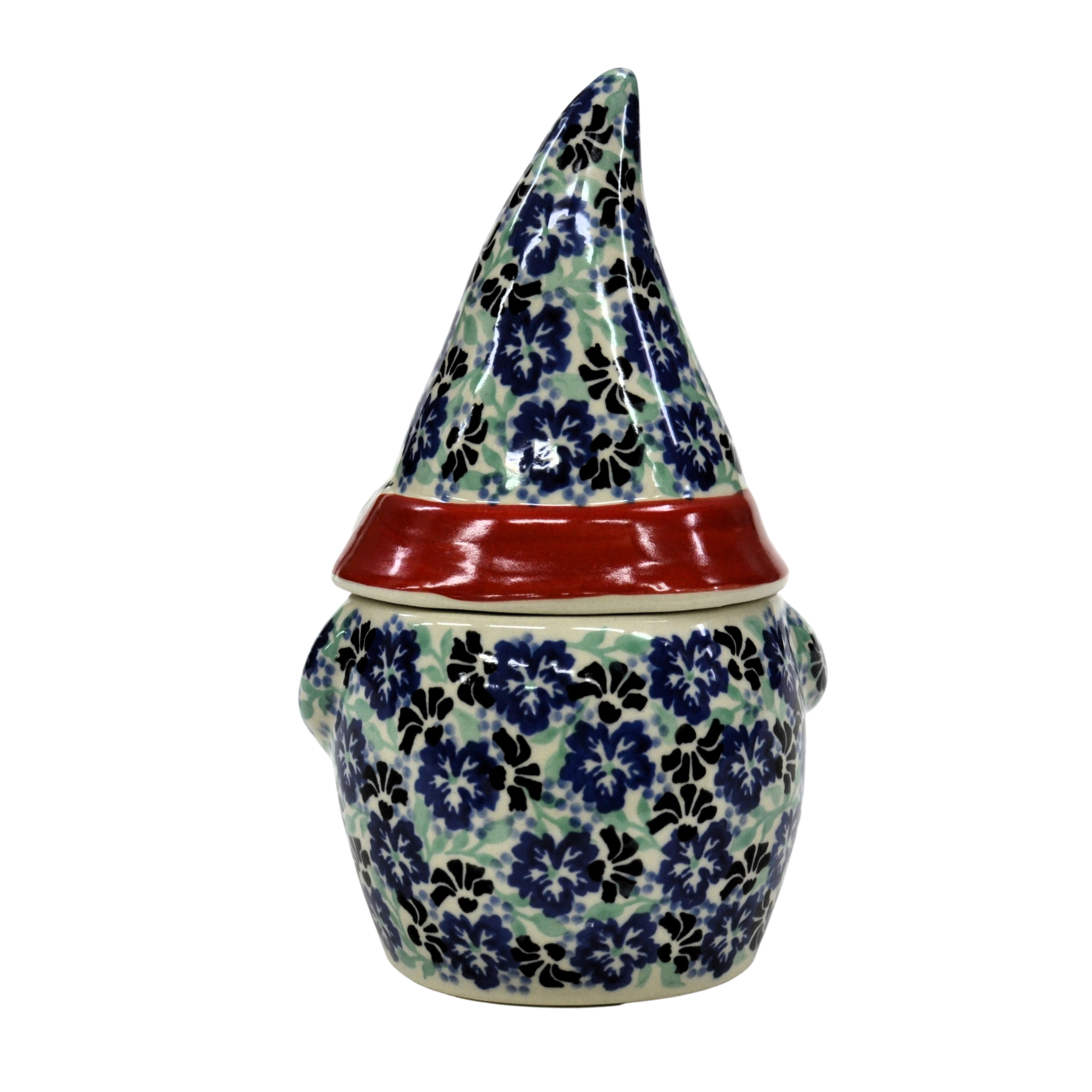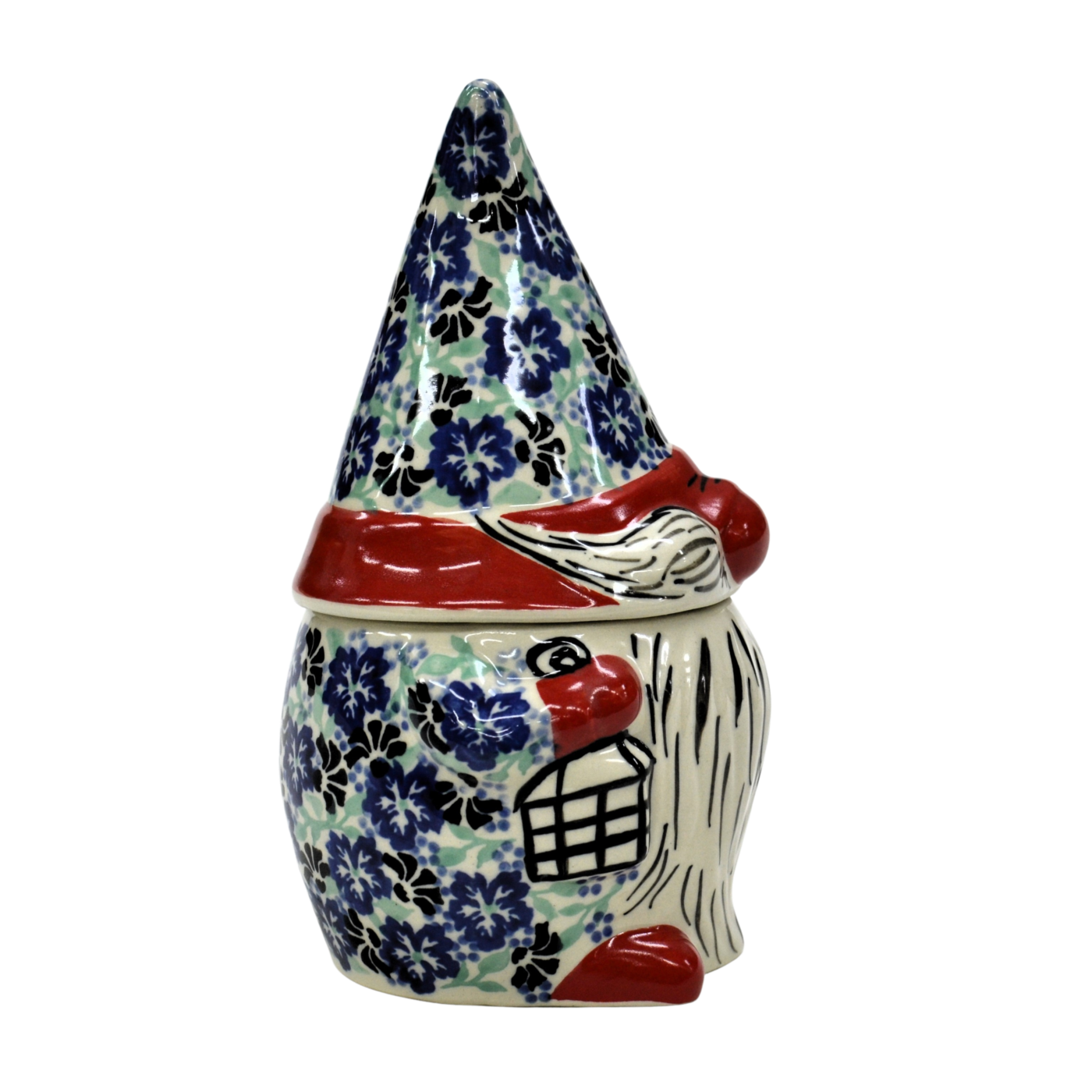 Pojemnik ceramiczny w kształcie Krasnala, gnoma z przykrywką ceramiczną.