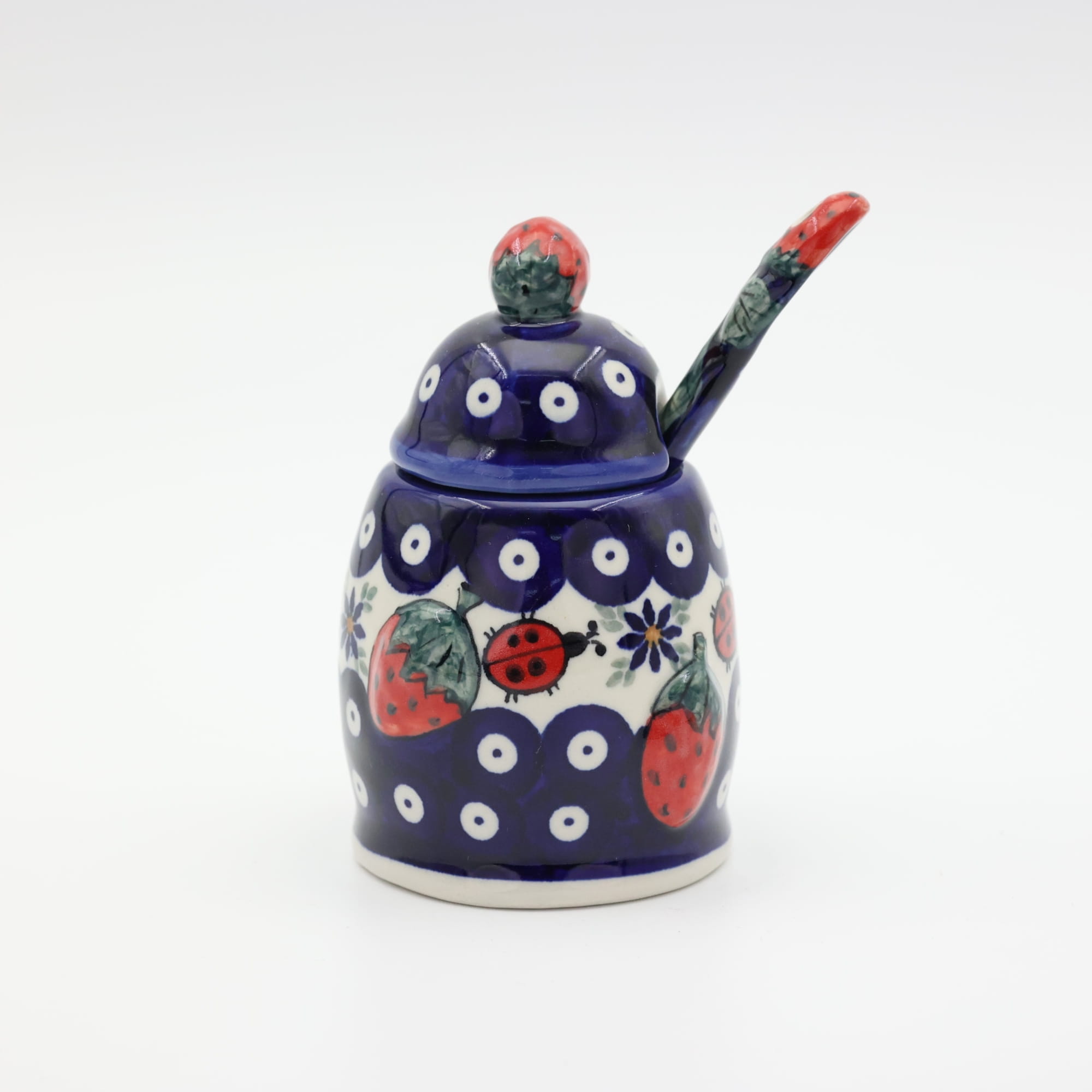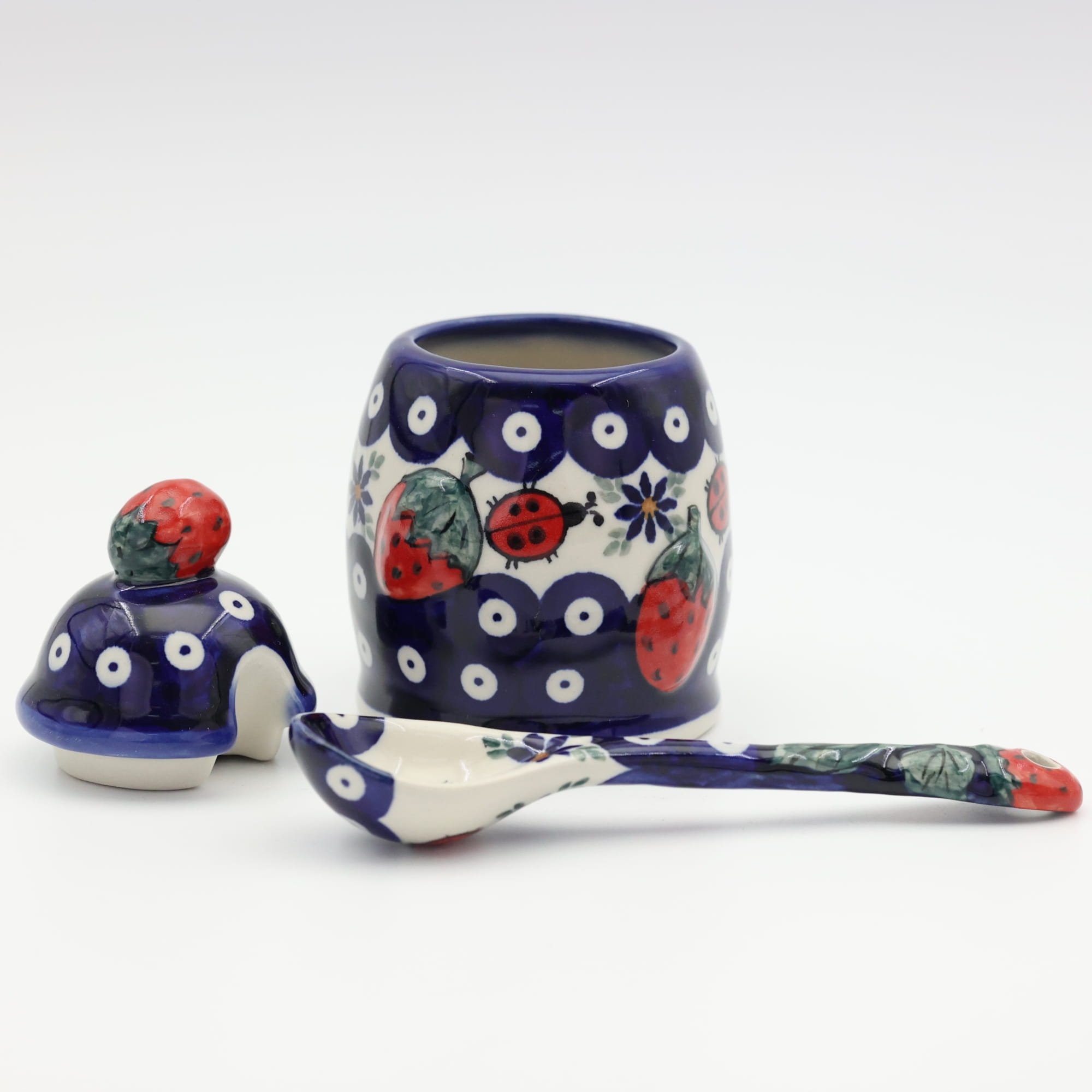 Ceramiczny pojemnik na dżem z nabierakiem (łyżką ceramiczną) w zestawie, która również ma umieszczoną truskawkę w górnej części, po to aby perfekcyjnie pasowała do pojemnika.