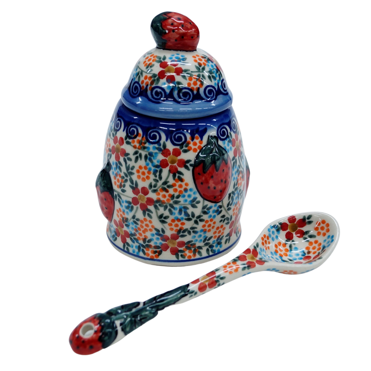 Ceramiczny pojemnik na dżem z nabierakiem (łyżką ceramiczną) w zestawie, która również ma umieszczoną truskawkę w górnej części, po to aby perfekcyjnie pasowała do pojemnika.