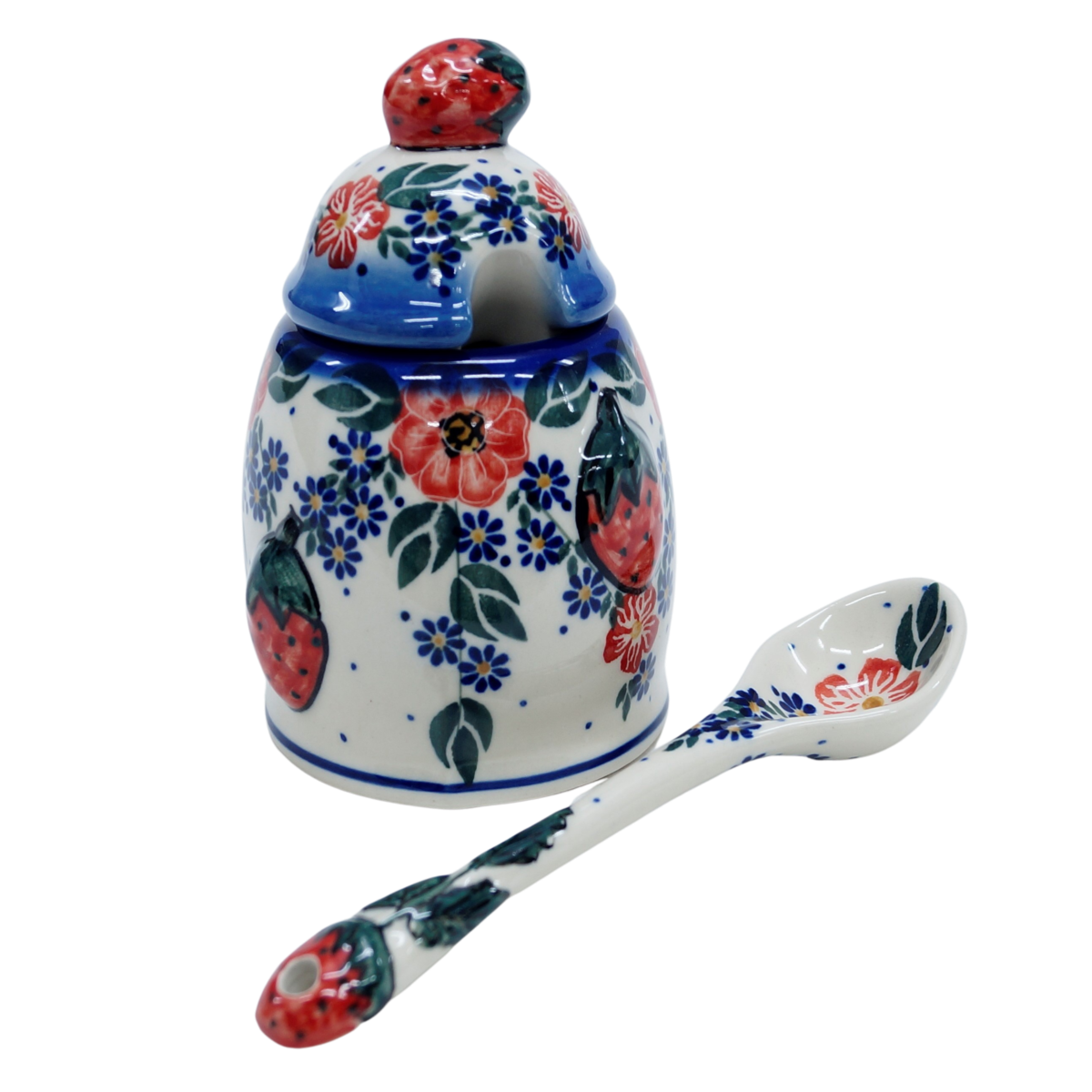 Ceramiczny pojemnik na dżem z nabierakiem (łyżką ceramiczną) w zestawie, która również ma umieszczoną truskawkę w górnej części, po to aby perfekcyjnie pasowała do pojemnika.