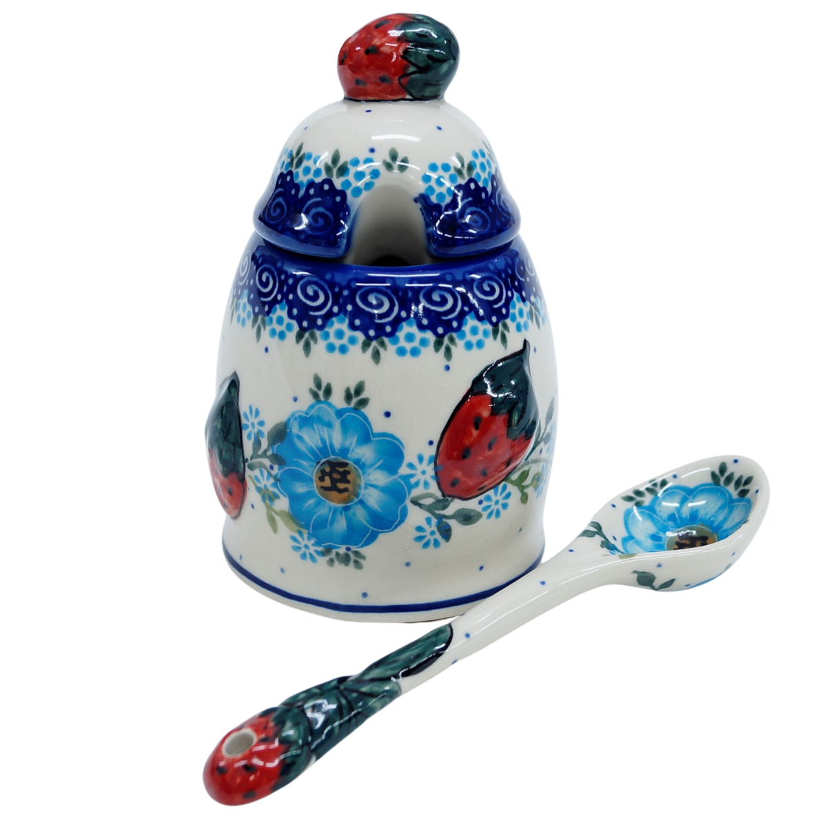 Ceramiczny pojemnik na dżem z nabierakiem (łyżką ceramiczną) w zestawie, która również ma umieszczoną truskawkę w górnej części, po to aby perfekcyjnie pasowała do pojemnika.