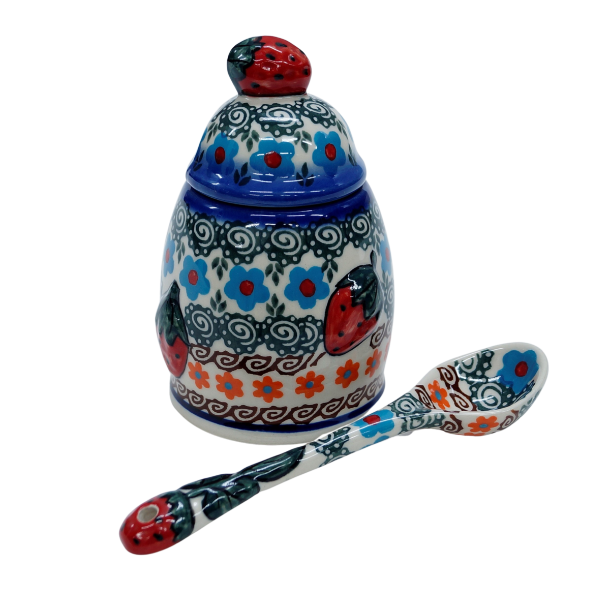 Ceramiczny pojemnik na dżem z nabierakiem (łyżką ceramiczną) w zestawie, która również ma umieszczoną truskawkę w górnej części, po to aby perfekcyjnie pasowała do pojemnika.