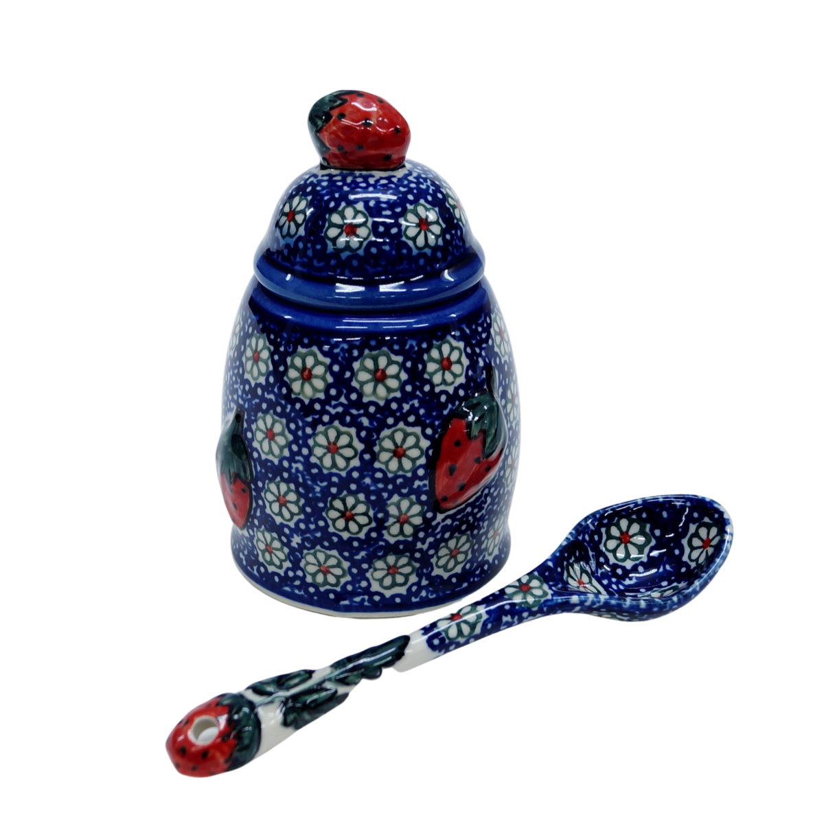 Ceramiczny pojemnik na dżem z nabierakiem (łyżką ceramiczną) w zestawie, która również ma umieszczoną truskawkę w górnej części, po to aby perfekcyjnie pasowała do pojemnika.