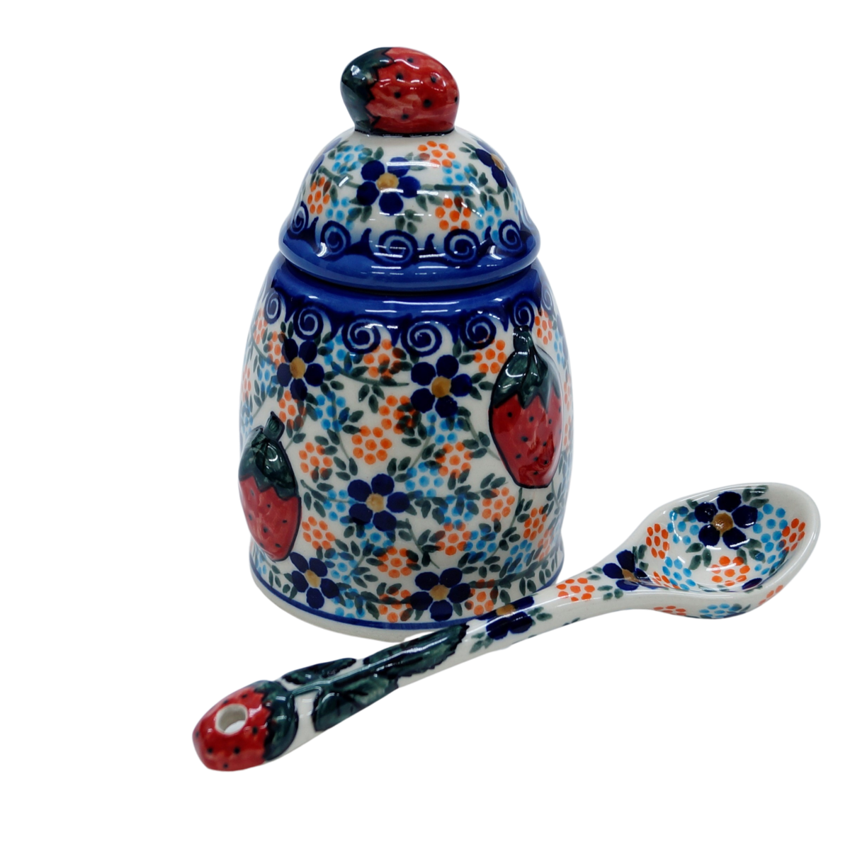 Ceramiczny pojemnik na dżem z nabierakiem (łyżką ceramiczną) w zestawie, która również ma umieszczoną truskawkę w górnej części, po to aby perfekcyjnie pasowała do pojemnika.