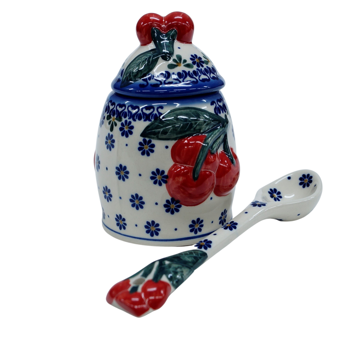 Ceramiczny pojemnik na dżem z nabierakiem (łyżką ceramiczną) w zestawie, która również ma umieszczoną wiśnię w górnej części, po to aby perfekcyjnie pasowała do pojemnika i ułatwiała otwieranie.