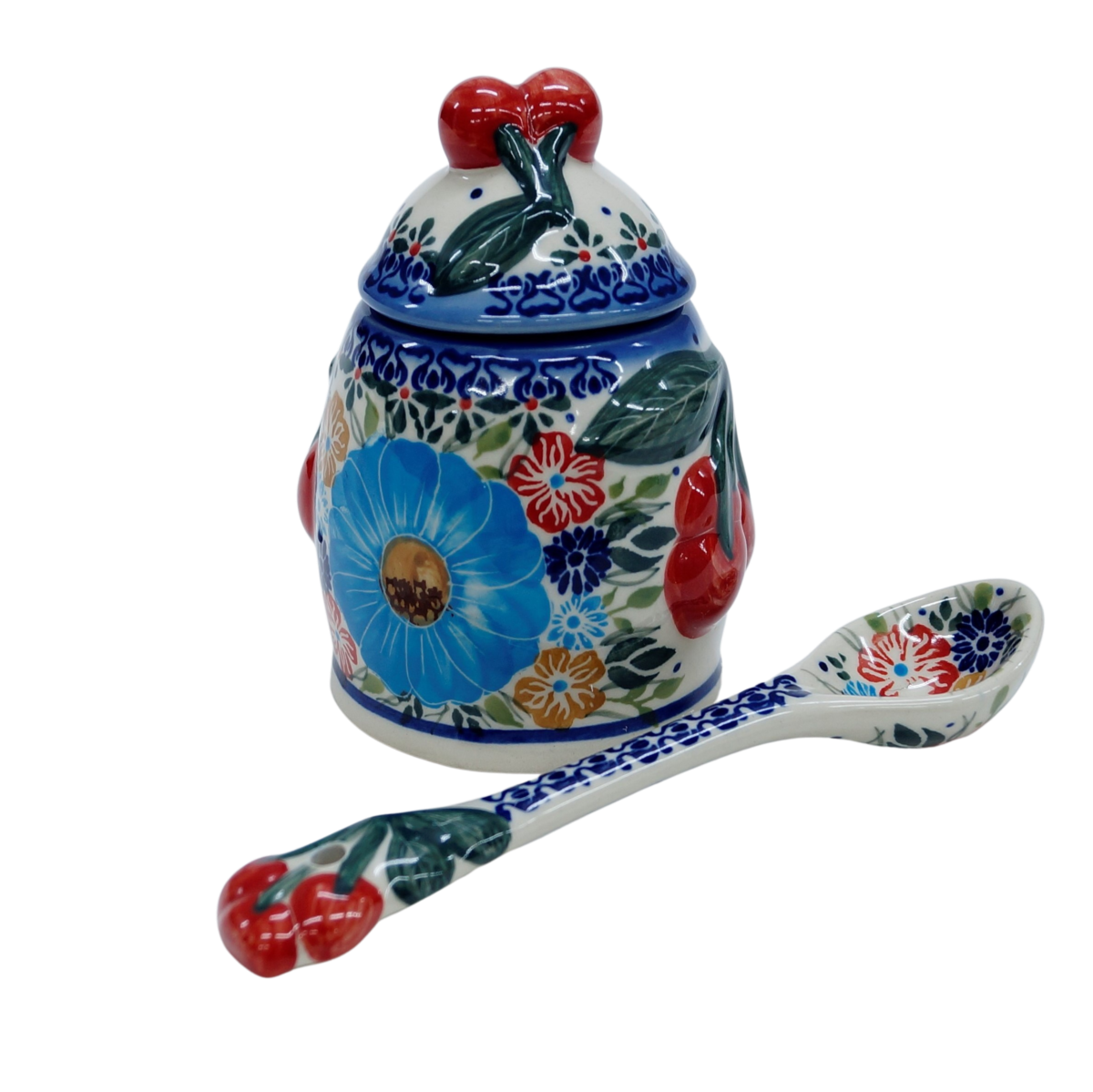 Ceramiczny pojemnik na dżem z nabierakiem (łyżką ceramiczną) w zestawie, która również ma umieszczoną wiśnię w górnej części, po to aby perfekcyjnie pasowała do pojemnika i ułatwiała otwieranie.