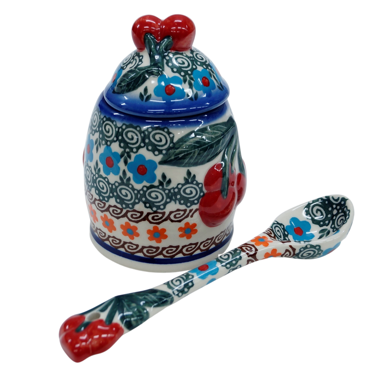 Ceramiczny pojemnik na dżem z nabierakiem (łyżką ceramiczną) w zestawie, która również ma umieszczoną wiśnię w górnej części, po to aby perfekcyjnie pasowała do pojemnika i ułatwiała otwieranie.