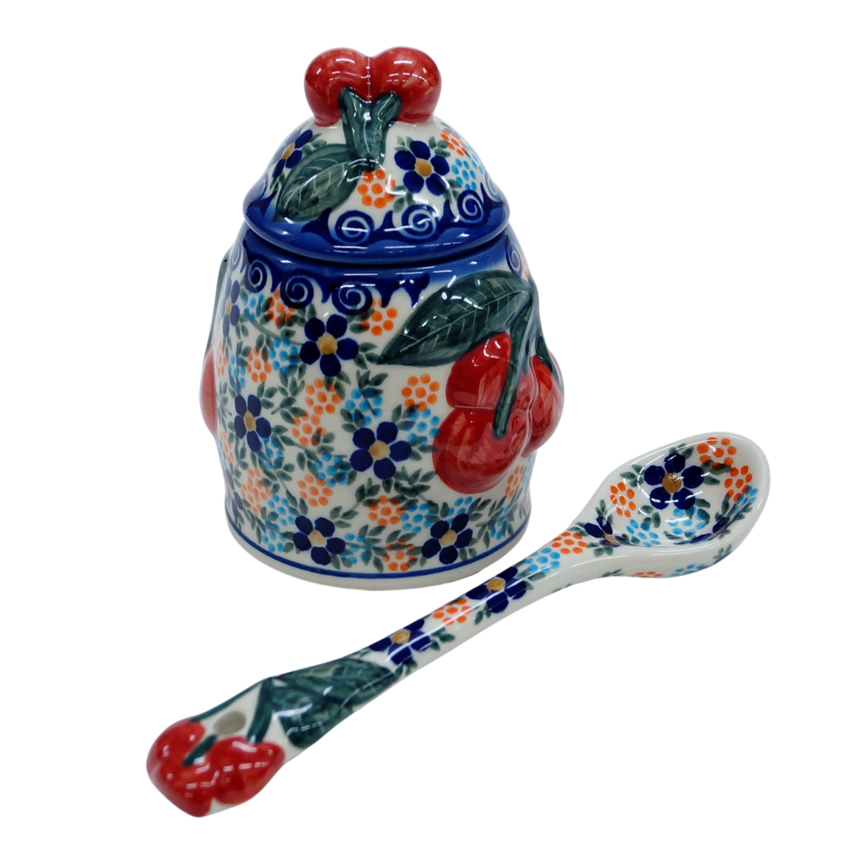 Ceramiczny pojemnik na dżem z nabierakiem (łyżką ceramiczną) w zestawie, która również ma umieszczoną wiśnię w górnej części, po to aby perfekcyjnie pasowała do pojemnika i ułatwiała otwieranie.