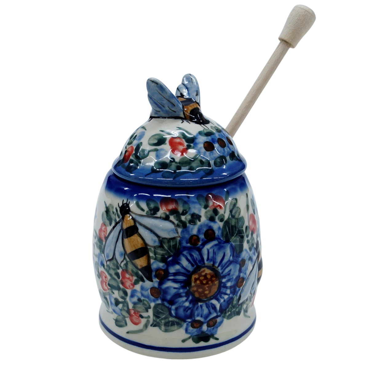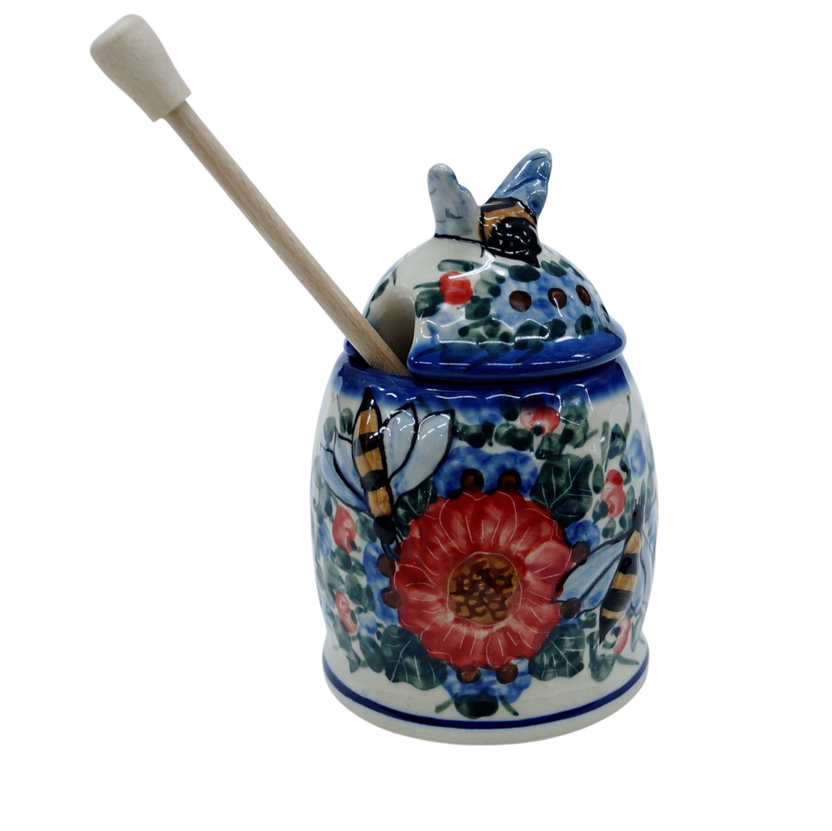 Pojemnik na miód z nabierakiem drewnianym w unikatowych dekoracjach artystycznych prosto z rodzinnej manufaktury w Bolesławcu, marki ANDY Ceramika. Pojemnik ceramiczny z pokrywką ceramiczną w kształcie pszczelego ula, plastra miodu, z drewnianym nabierakiem będzie nie tylko bardzo praktycznym naczyniem, ale i ozdobą naszej kuchni podczas przechowywania i podawania miodu.