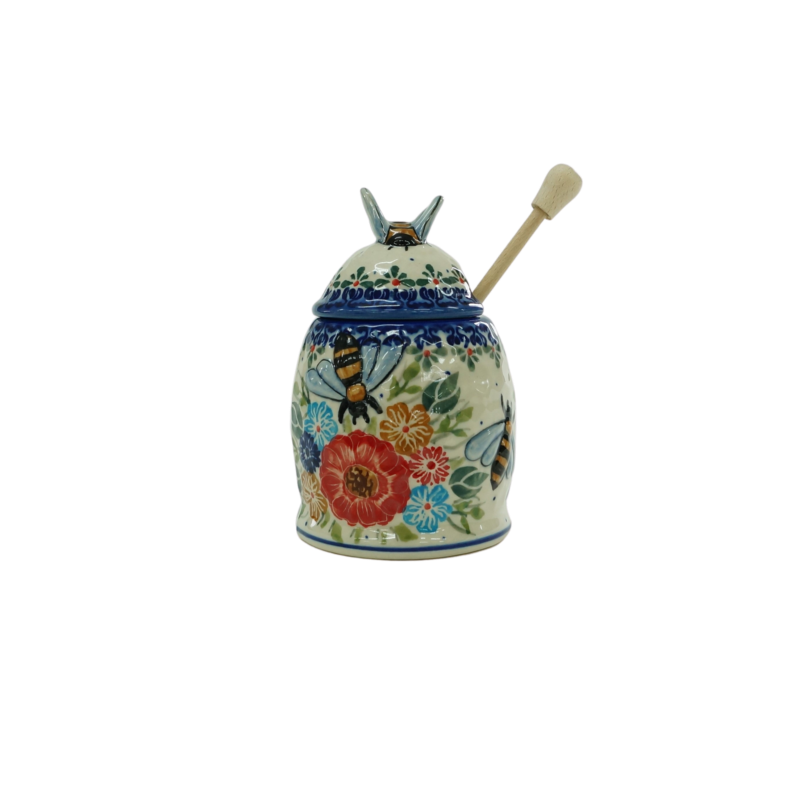 Pojemnik na miód z nabierakiem drewnianym w unikatowych dekoracjach artystycznych prosto z rodzinnej manufaktury w Bolesławcu, marki ANDY Ceramika. Pojemnik ceramiczny z pokrywką ceramiczną w kształcie pszczelego ula, plastra miodu, z drewnianym nabierakiem będzie nie tylko bardzo praktycznym naczyniem, ale i ozdobą naszej kuchni podczas przechowywania i podawania miodu.