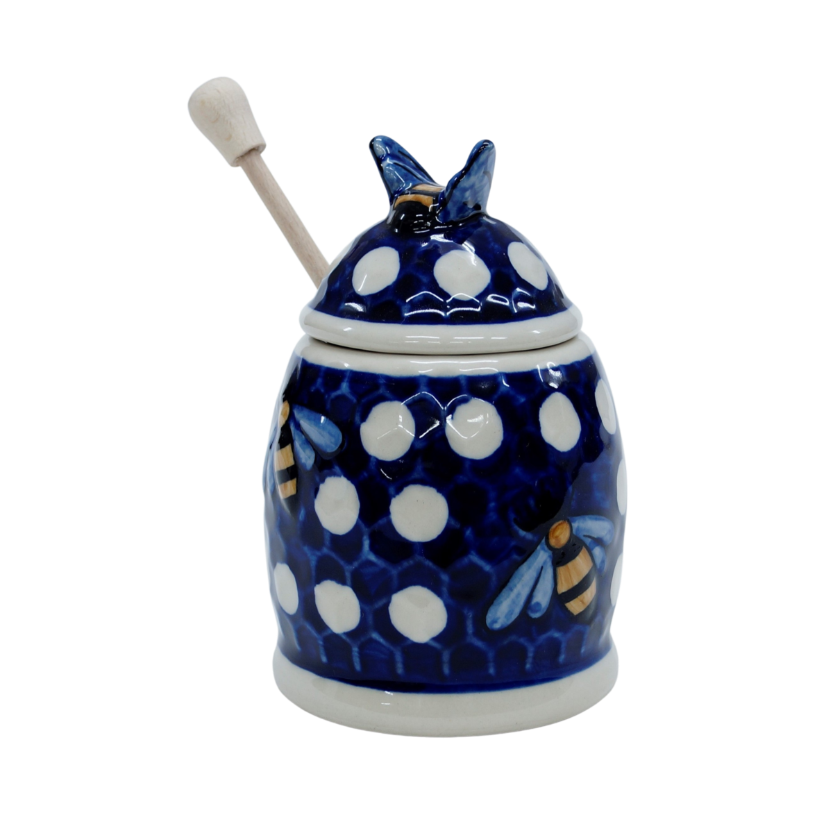 Pojemnik na miód z nabierakiem drewnianym w unikatowych dekoracjach artystycznych prosto z rodzinnej manufaktury w Bolesławcu, marki ANDY Ceramika. Pojemnik ceramiczny z pokrywką ceramiczną w kształcie pszczelego ula, plastra miodu, z drewnianym nabierakiem będzie nie tylko bardzo praktycznym naczyniem, ale i ozdobą naszej kuchni podczas przechowywania i podawania miodu.