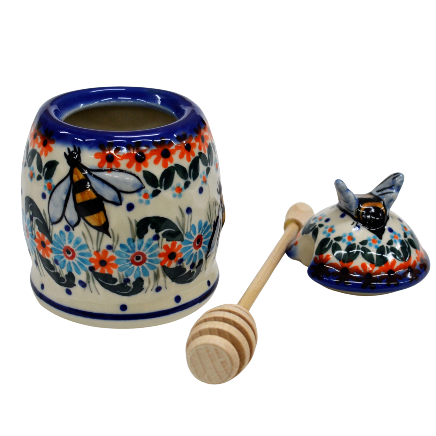 Pojemnik na miód z nabierakiem drewnianym w unikatowych dekoracjach artystycznych prosto z rodzinnej manufaktury w Bolesławcu, marki ANDY Ceramika. Pojemnik ceramiczny z pokrywką ceramiczną w kształcie pszczelego ula, plastra miodu, z drewnianym nabierakiem będzie nie tylko bardzo praktycznym naczyniem, ale i ozdobą naszej kuchni podczas przechowywania i podawania miodu.