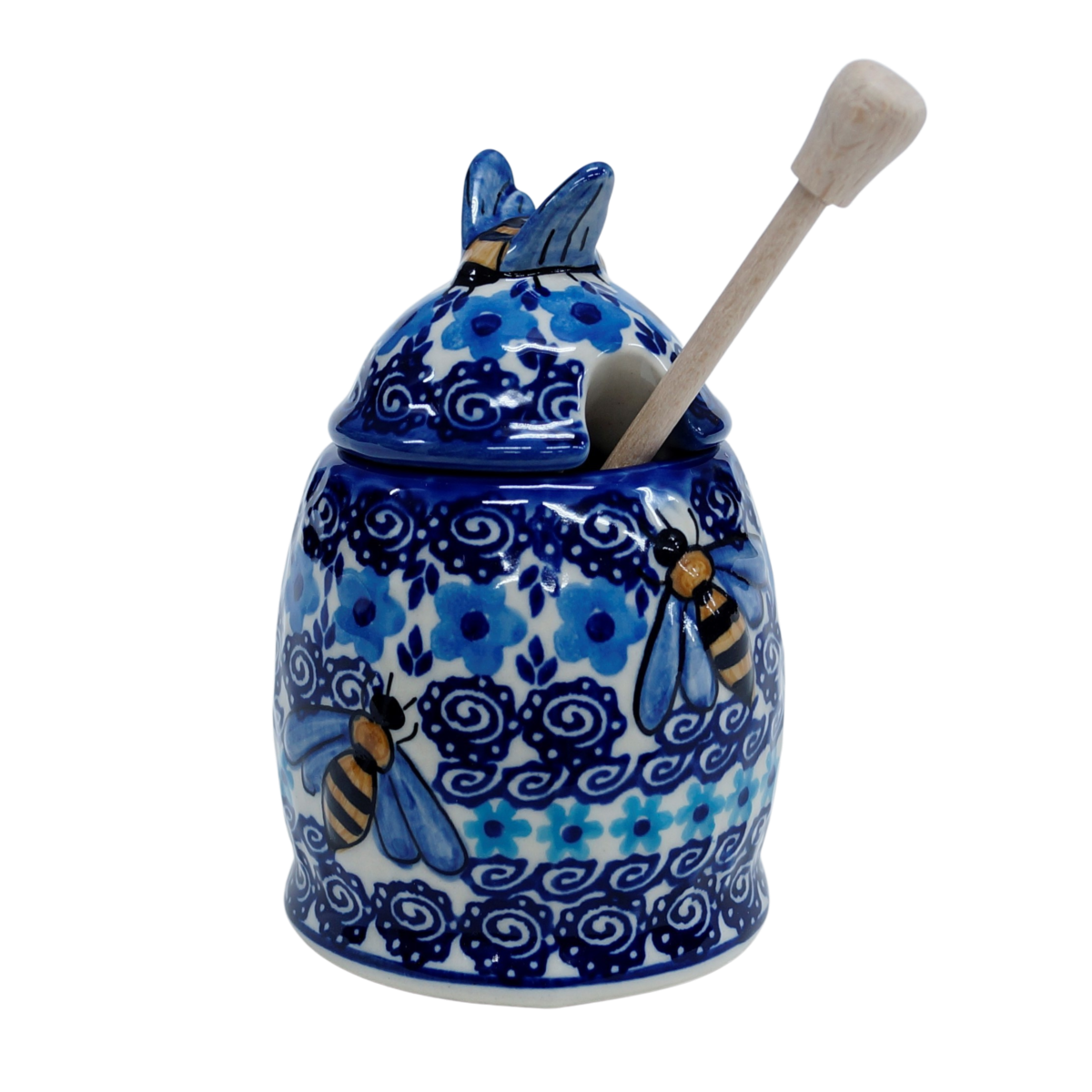 Pojemnik na miód z nabierakiem drewnianym w unikatowych dekoracjach artystycznych prosto z rodzinnej manufaktury w Bolesławcu, marki ANDY Ceramika. Pojemnik ceramiczny z pokrywką ceramiczną w kształcie pszczelego ula, plastra miodu, z drewnianym nabierakiem będzie nie tylko bardzo praktycznym naczyniem, ale i ozdobą naszej kuchni podczas przechowywania i podawania miodu.