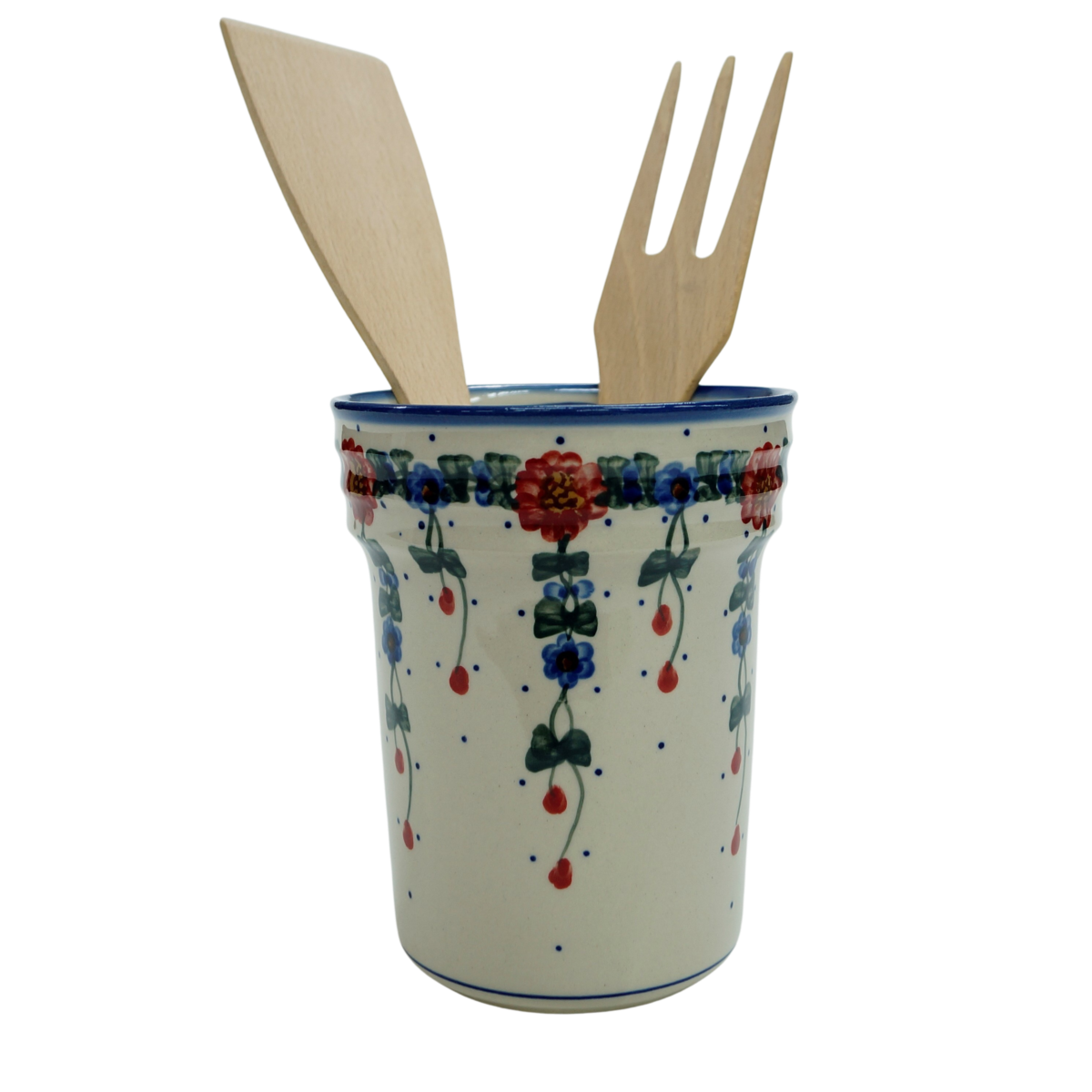 Kuchnia to miejsce w domu, w którym naszym zdaniem dzieje się najwięcej. Każda gospodyni domowa lub hobbystyczny kucharz wiedzą, że porządek w trakcie przygotowywania potraw w garnkach, misach, patelniach czy naczyniach do pieczenia lub zapiekania jest bardzo ważny. Ceramika bolesławiecka jest produktem ukierunkowanym na funkcjonalność i użyteczność. Porządek w kuchni zapewniają różnego typu naczynia i pojemniki do przechowywania, jednym z nich jest pojemnik na przybory kuchenne w którym umieścisz liczne drewniane łyżki, nabieraki, chochle czy łopatki do smażenia. Pojemnik jest ręcznie dekorowany, w tradycyjny sposób zdobienia ceramiki kamionkowej z Bolesławca. Może pomieścić z tuzin łyżek a i tak będzie wystarczający duży na dołożenie kilku kolejnych. Prawda, że przyciąga oko i sprawia wrażenie solidnego garnka pochodzeniem z ziemi bolesławieckiej?