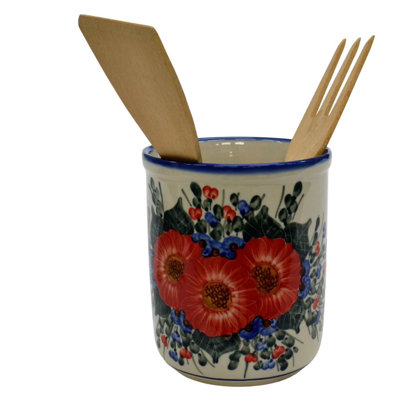 Oryginalny produkt artystycznej ceramiki bolesławieckiej, ręcznie zdobionej - pojemnik na przybory kuchenne duży, ręcznie dekorowany w unikatowe dekoracje oraz tradycyjne stempelkowe, tworzone od wieków.