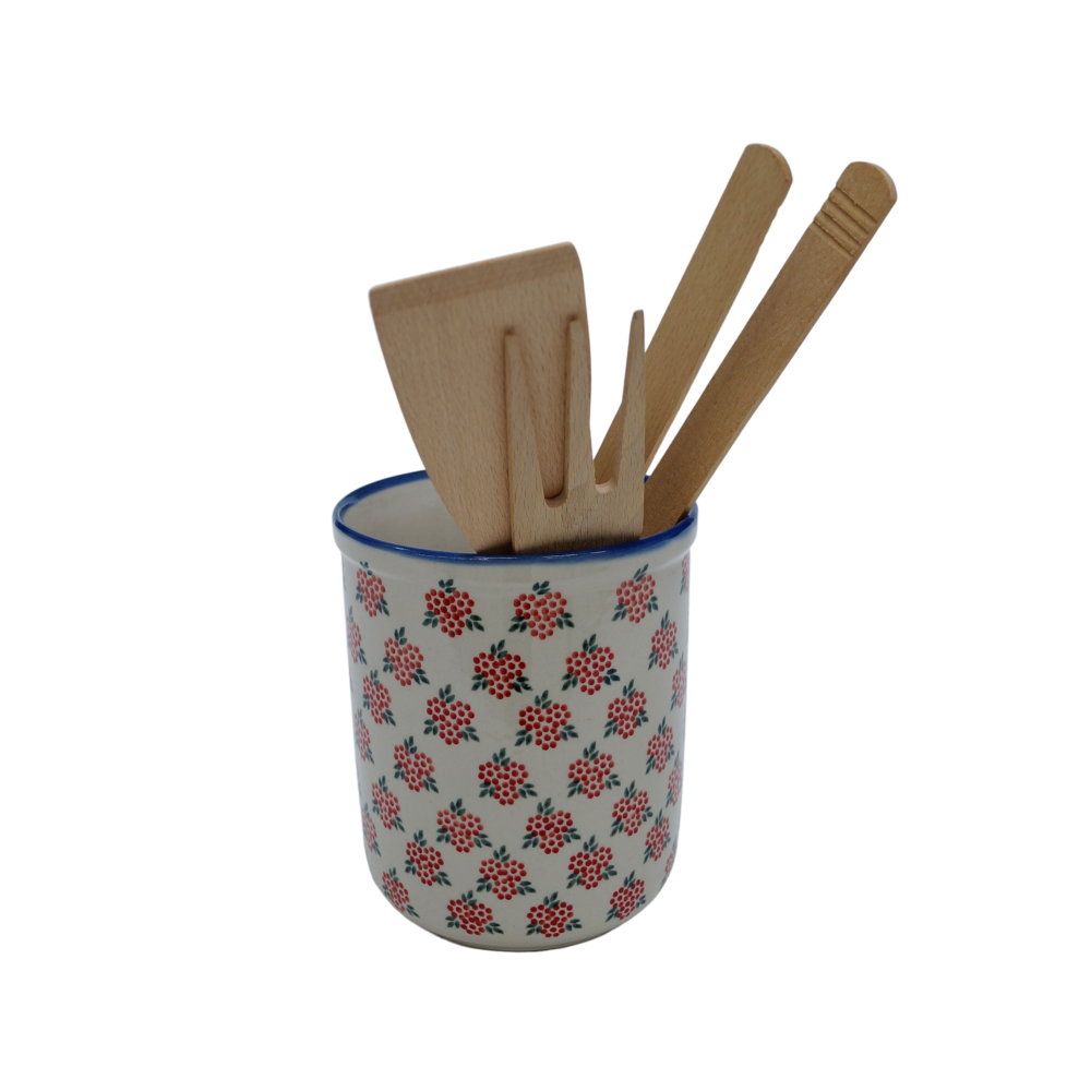 Pojemny kubek - pojemnik, pomieści bez problemu komplet niezbędnych łyżek drewnianych czy metalowych i tych z tworzyw sztucznych, chochli, łopatek i innych przyborów kuchennych. Ponadto ładnie się prezentuje, dzięki czemu będzie praktyczną ozdobą naszej kuchni i bardzo przydatnym naczyniem ceramicznych. Łatwy w pielęgnacji, szkliwiony również wewnątrz sprawa iż mycie jest bardzo łatwe i szybkie.