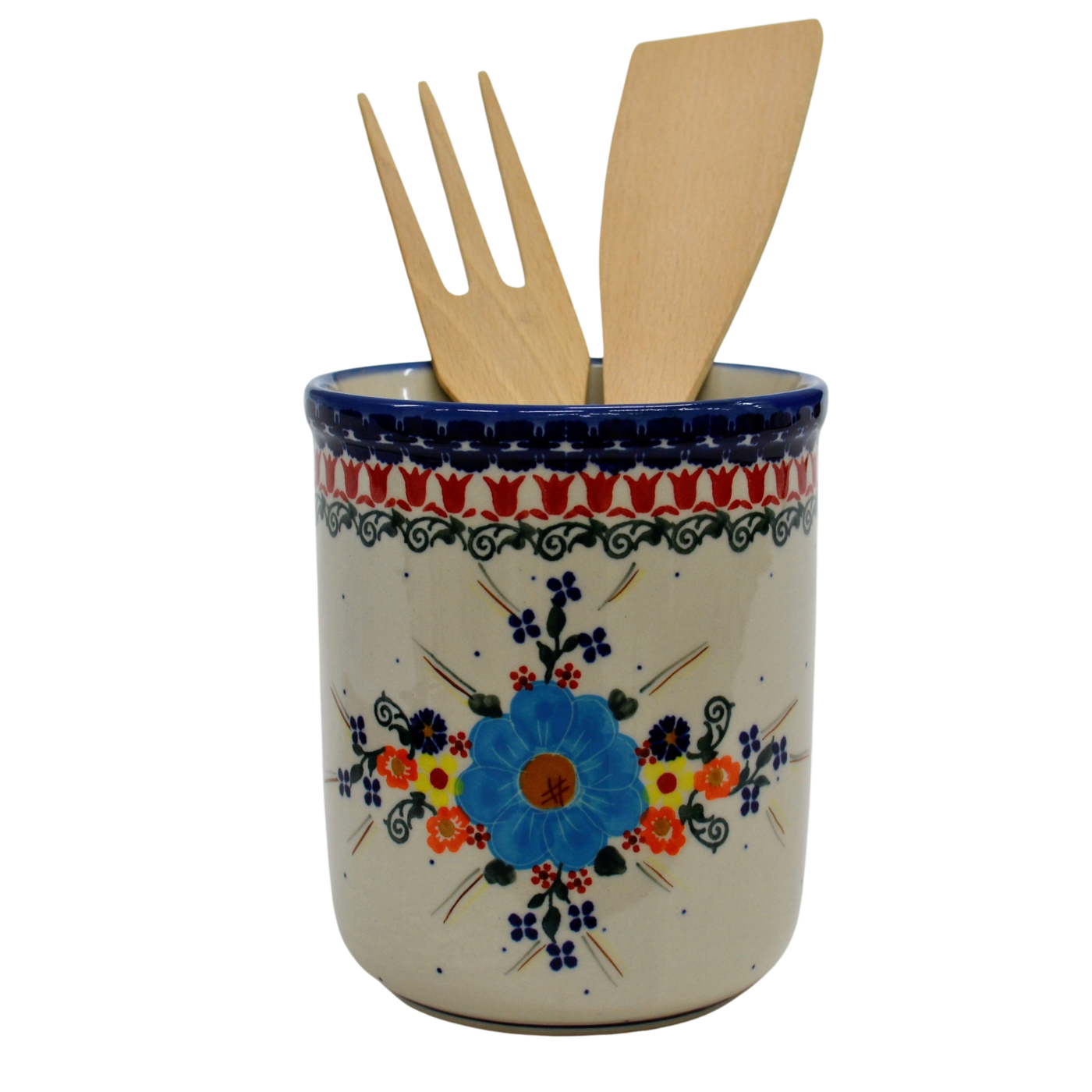 Oryginalny produkt artystycznej ceramiki bolesławieckiej, ręcznie zdobionej - pojemnik na przybory kuchenne duży, ręcznie dekorowany w unikatowe dekoracje oraz tradycyjne stempelkowe, tworzone od wieków.