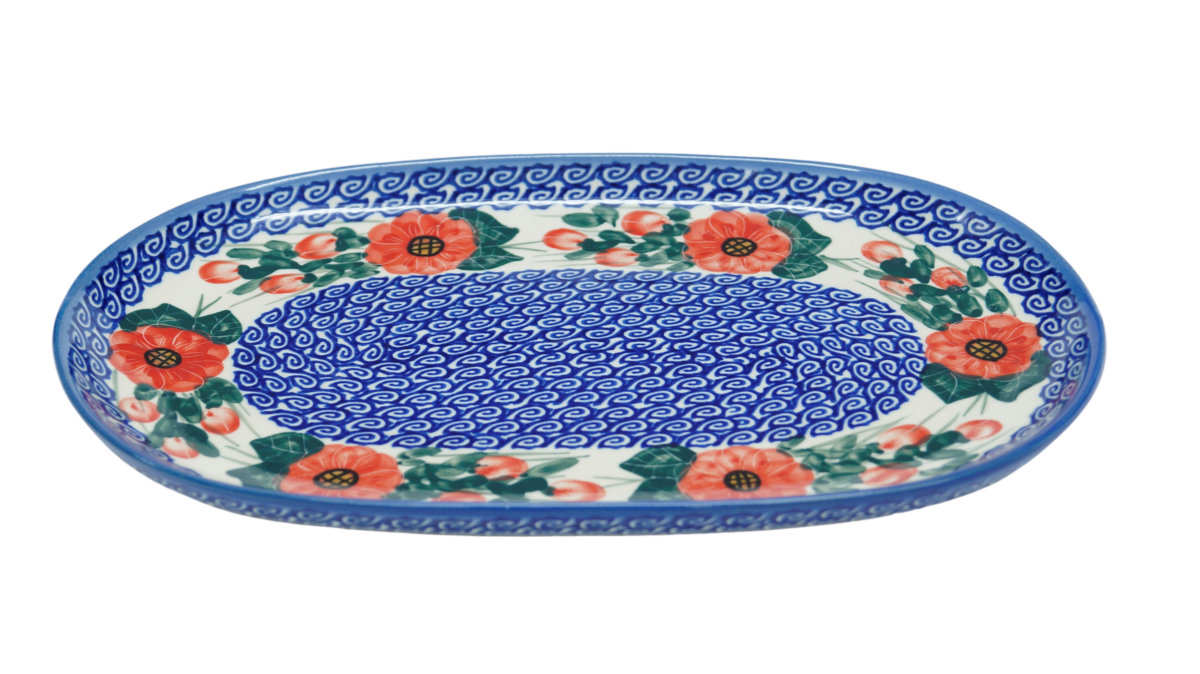 Oryginalny produkt ceramiki bolesławieckiej artystycznej - półmisek owalny średni o długości 28 cm, ręcznie malowany w rodzinnej fabryce, oryginalnej ceramiki bolesławieckiej, ANDY Ceramika.
