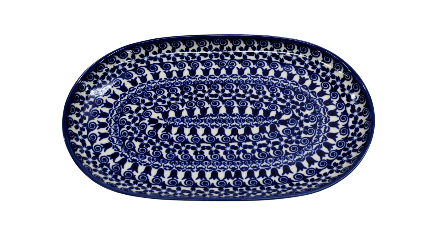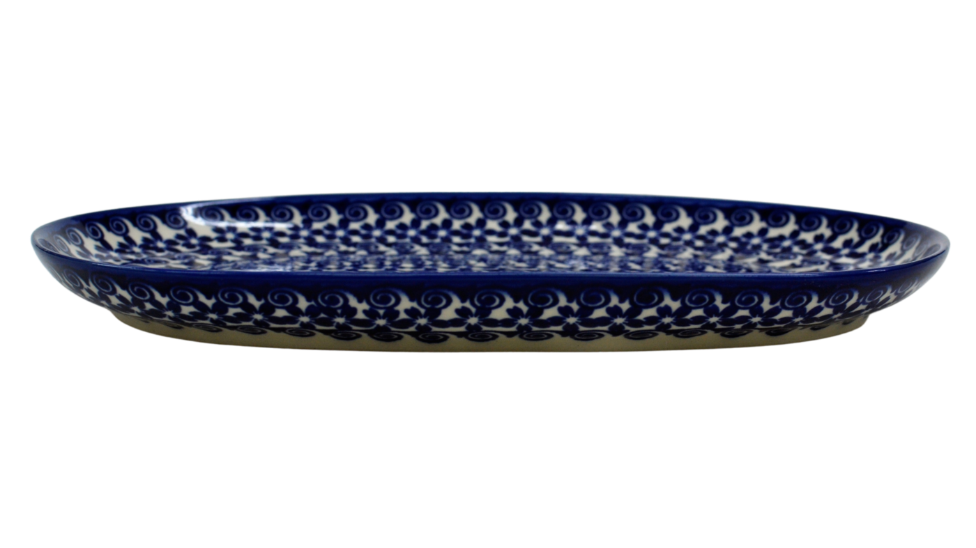 Półmisek duży o owalnym kształcie stanowi połączenie elementu dekoracyjnego i użytkowego. Klasyczny kształt pasujący do każdego wystroju kuchni i domu. Pięknie wkomponuje się w inne elementy zastawy ceramiki bolesławieckiej, tworząc idealną całość serwisu obiadowego i zestawu kawowego.