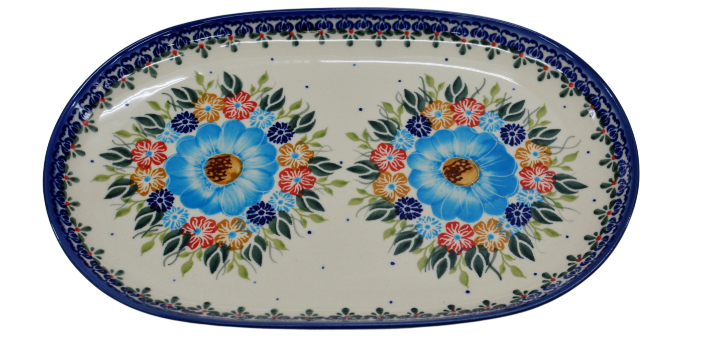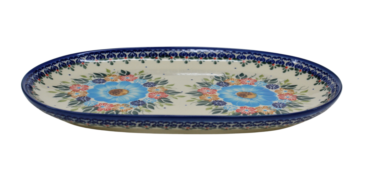 Półmisek duży o owalnym kształcie stanowi połączenie elementu dekoracyjnego i użytkowego. Klasyczny kształt pasujący do każdego wystroju kuchni i domu. Pięknie wkomponuje się w inne elementy zastawy ceramiki bolesławieckiej, tworząc idealną całość serwisu obiadowego i zestawu kawowego.