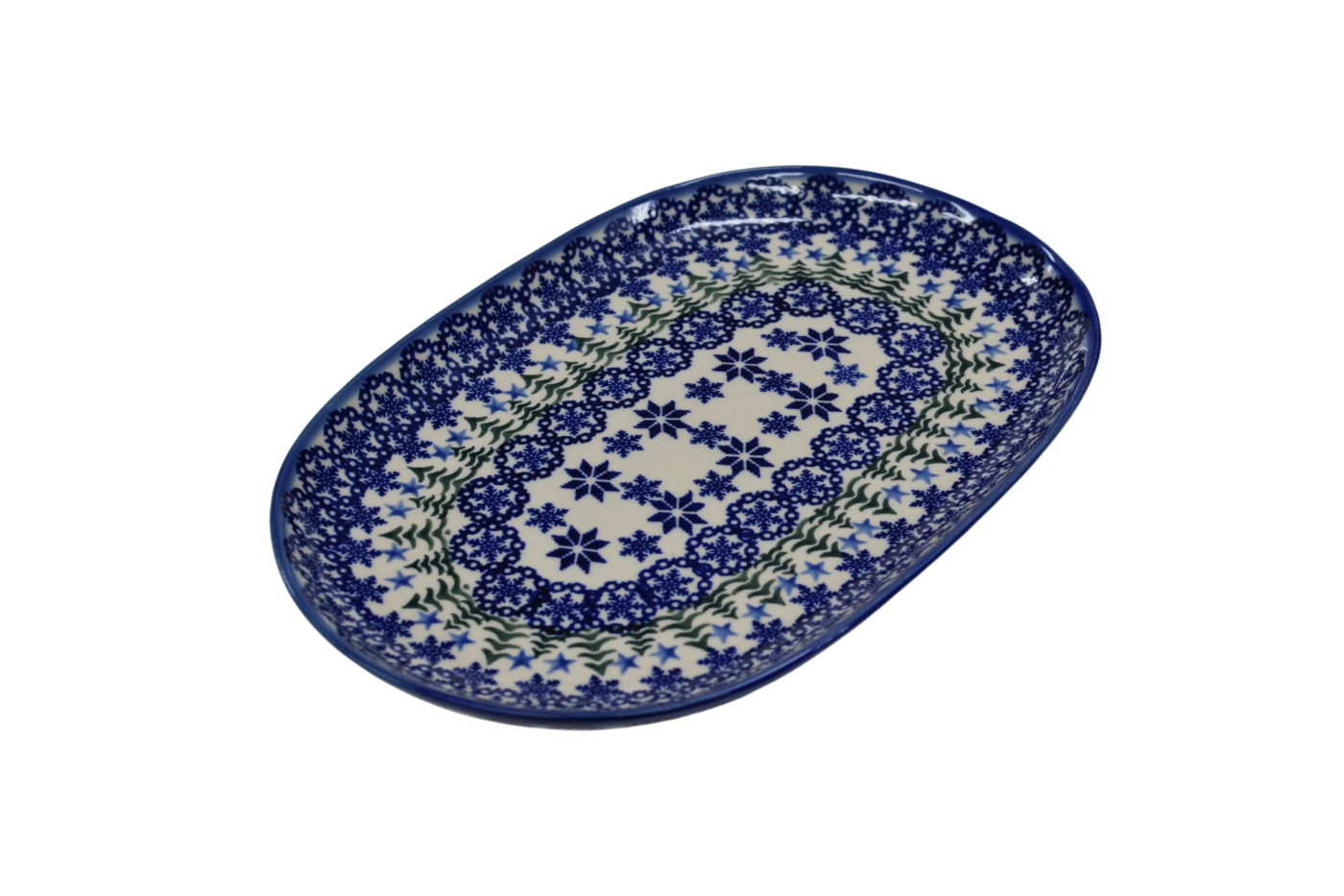 Półmisek duży o owalnym kształcie stanowi połączenie elementu dekoracyjnego i użytkowego. Klasyczny kształt pasujący do każdego wystroju kuchni i domu. Pięknie wkomponuje się w inne elementy zastawy ceramiki bolesławieckiej, tworząc idealną całość serwisu obiadowego i zestawu kawowego.