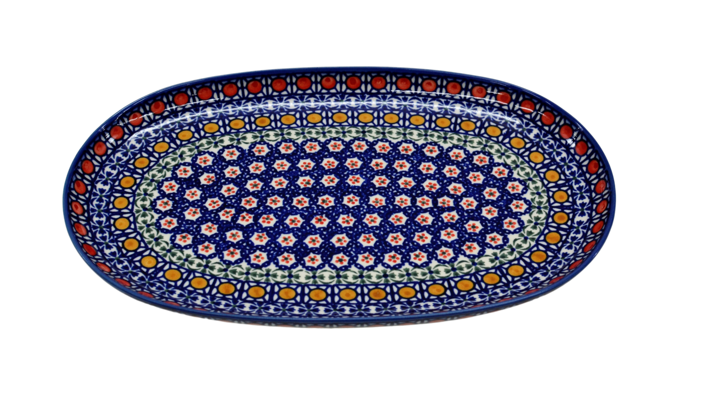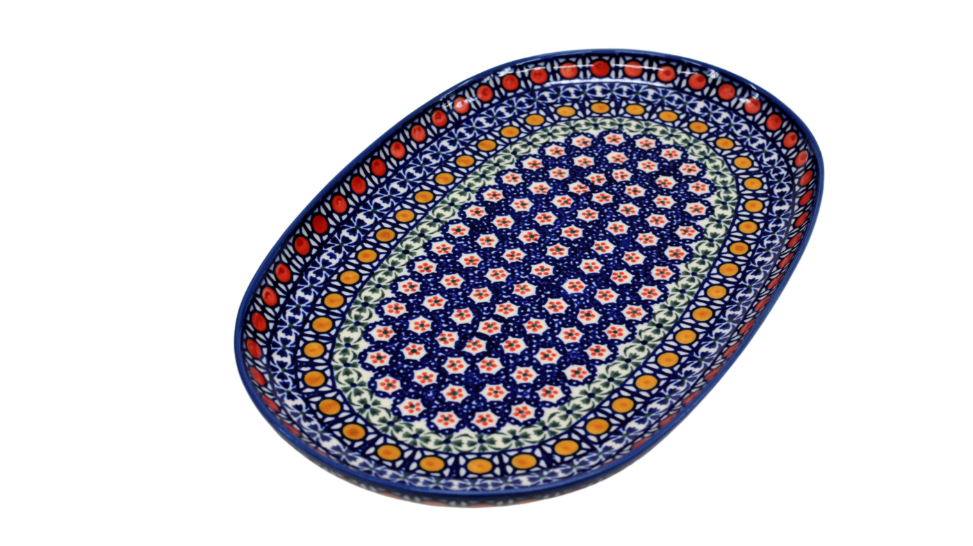 Oryginalny produkt ceramiki bolesławieckiej artystycznej - półmisek owalny duży o długości 33 cm, ręcznie malowany w rodzinnej fabryce oryginalnej ceramiki bolesławieckiej, ANDY Ceramika.