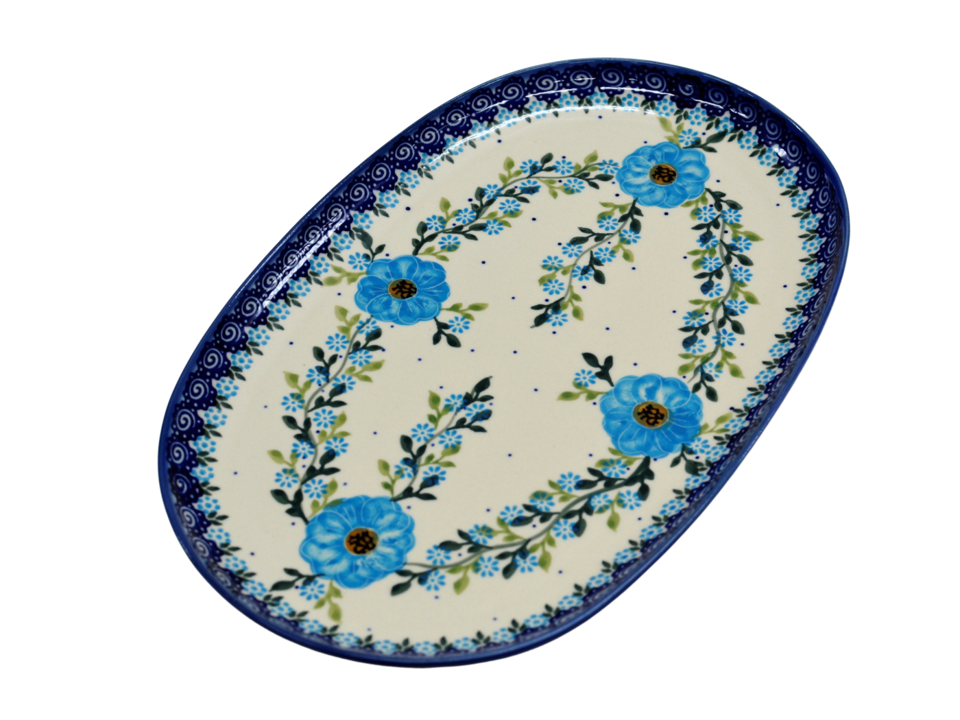 Półmisek duży o owalnym kształcie stanowi połączenie elementu dekoracyjnego i użytkowego. Klasyczny kształt pasujący do każdego wystroju kuchni i domu. Pięknie wkomponuje się w inne elementy zastawy ceramiki bolesławieckiej, tworząc idealną całość serwisu obiadowego i zestawu kawowego.