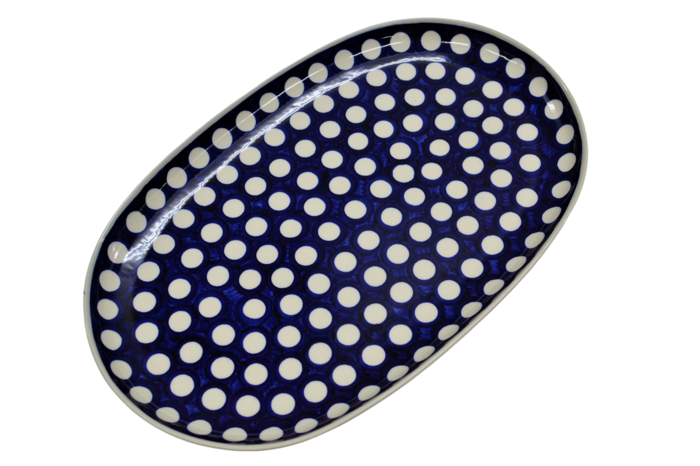 Półmisek duży o owalnym kształcie stanowi połączenie elementu dekoracyjnego i użytkowego. Klasyczny kształt pasujący do każdego wystroju kuchni i domu. Pięknie wkomponuje się w inne elementy zastawy ceramiki bolesławieckiej, tworząc idealną całość serwisu obiadowego i zestawu kawowego.
