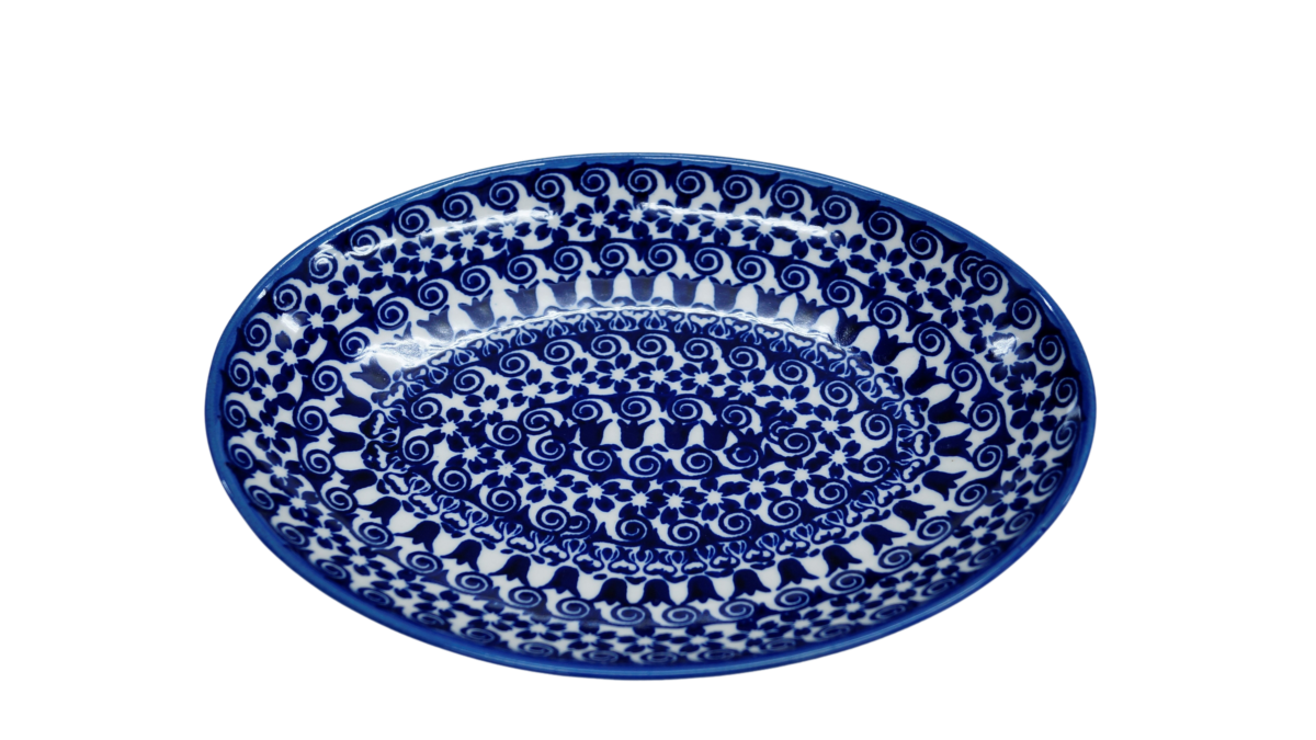 Oryginalny produkt ceramiki bolesławieckiej - półmisek jajko mały, ręcznie malowany wyrób ceramiki użytkowej, powstał w rodzinnej fabryce oryginalnej ceramiki bolesławieckiej, ANDY CERAMIKA.