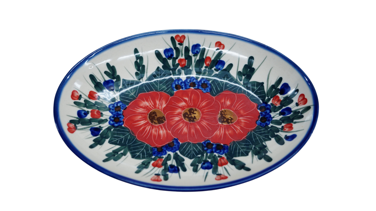 Oryginalny produkt ceramiki bolesławieckiej - półmisek jajko mały, ręcznie malowany wyrób ceramiki użytkowej, powstał w rodzinnej fabryce oryginalnej ceramiki bolesławieckiej, ANDY CERAMIKA.