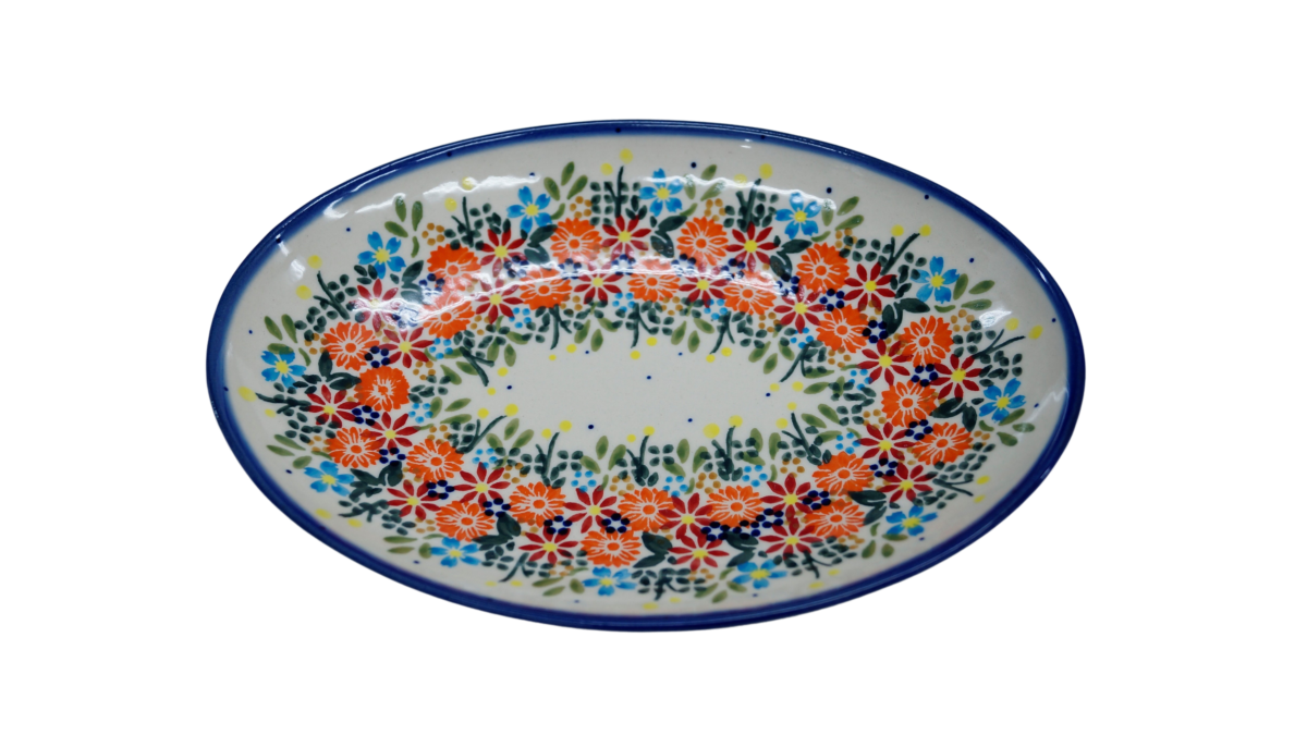 Oryginalny produkt ceramiki bolesławieckiej - półmisek jajko mały, ręcznie malowany wyrób ceramiki użytkowej, powstał w rodzinnej fabryce oryginalnej ceramiki bolesławieckiej, ANDY CERAMIKA.